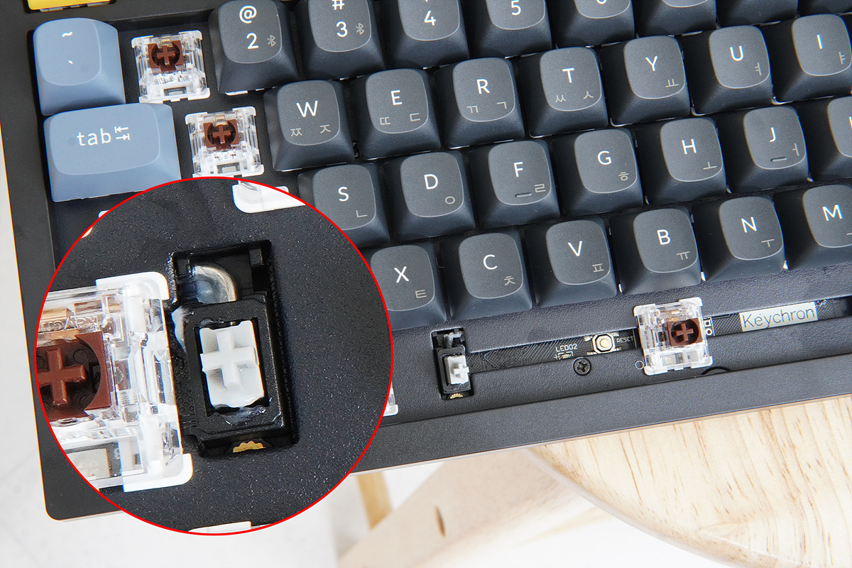 스위치가 결합되는 기판은 5핀으로 되어있으며 정방향 LED로 체리 프로파일(높이) 키캡도 간섭 없이 사용할 수 있습니다. 스테빌라이저는 기판에 나사로 고정되어 있어 쉽게 분리해서 수정이나 튜닝을 할 수 있습니다.