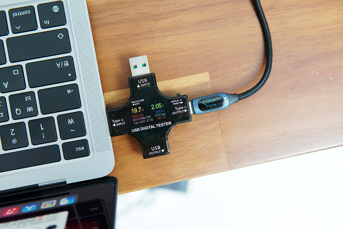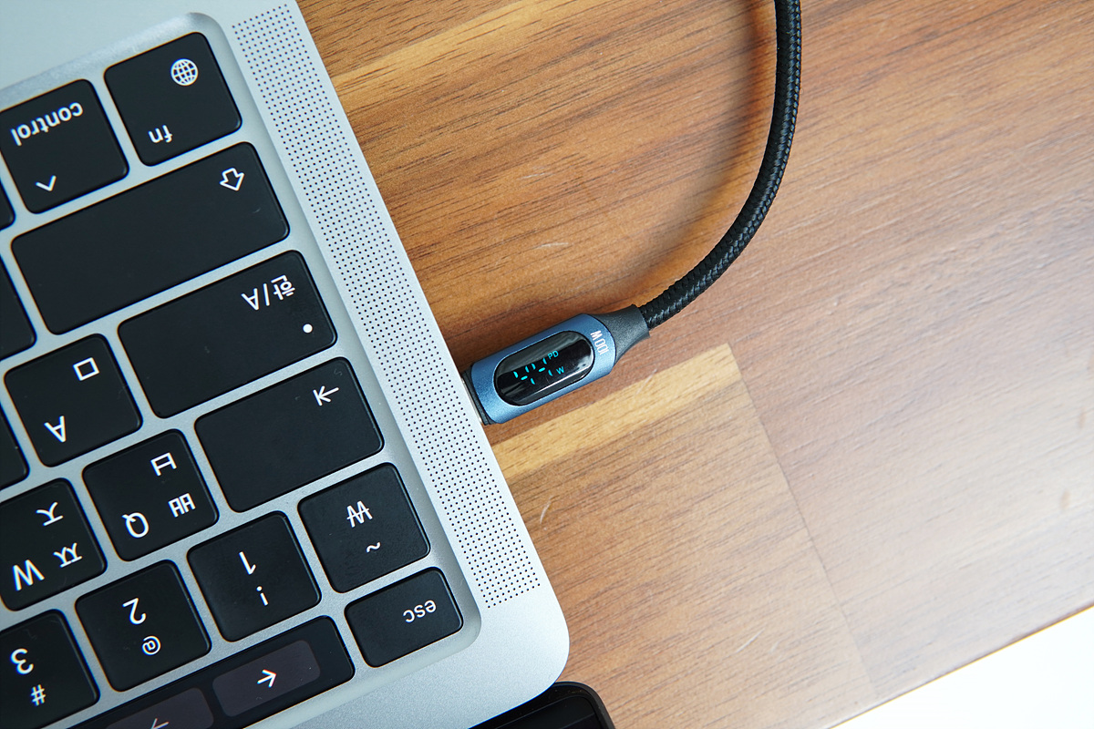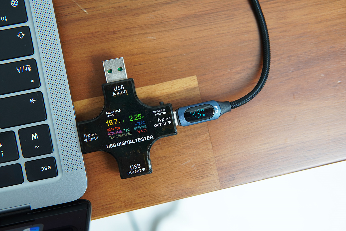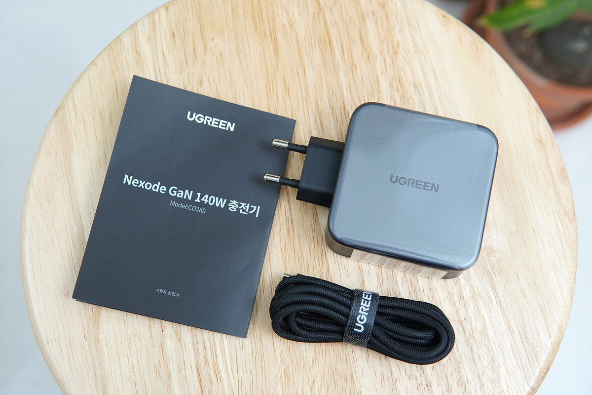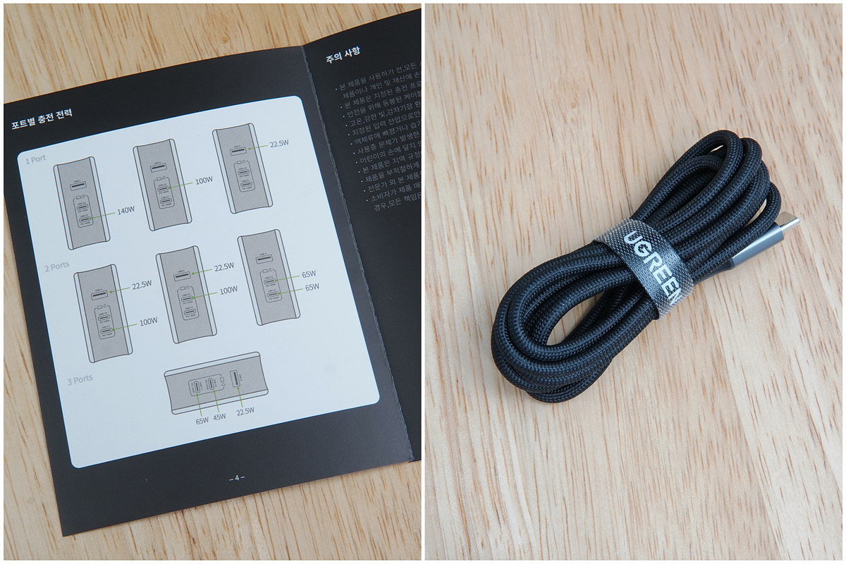 설명서에는 포트별 출력이 그림과 한글로 자세하게 표시가 되어 있으며 기본 구성품에 있는 케이블은 PD 3.1 규격에 맞게 240W 출력을 지원합니다. 보통 멀티 충전기에는 별도의 케이블이 없는 경우가 대부분이지만 유그린은 케이블을 꼭 한 개씩은 넣어주고 이 기본 케이블의 품질도 상당히 좋은 편입니다.