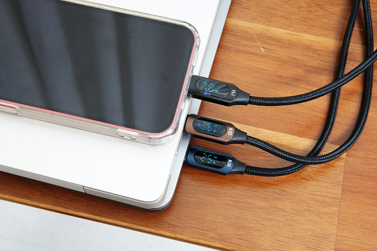 노트북 두 대, 스마트폰까지 연결해서 3포트 모두 고속 충전이 가능합니다. 포트별로 새로운 기기가 연결이 되거나 해제가 되면 충전이 잠시 멈춘 후 다시 충전이 됩니다. 출력을 조절하는 과정에서 전류를 일시적으로 중단하는 거라 제품 이상이 아니니 걱정하지 않으셔도 됩니다. ^^