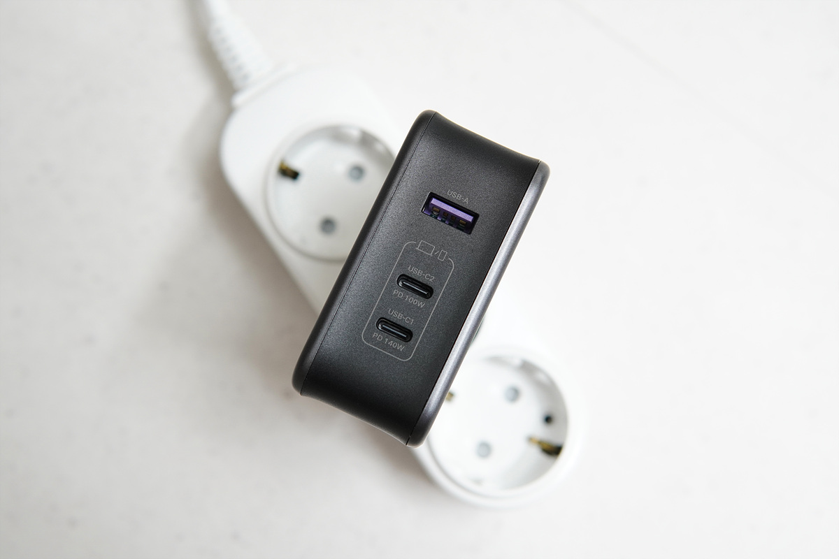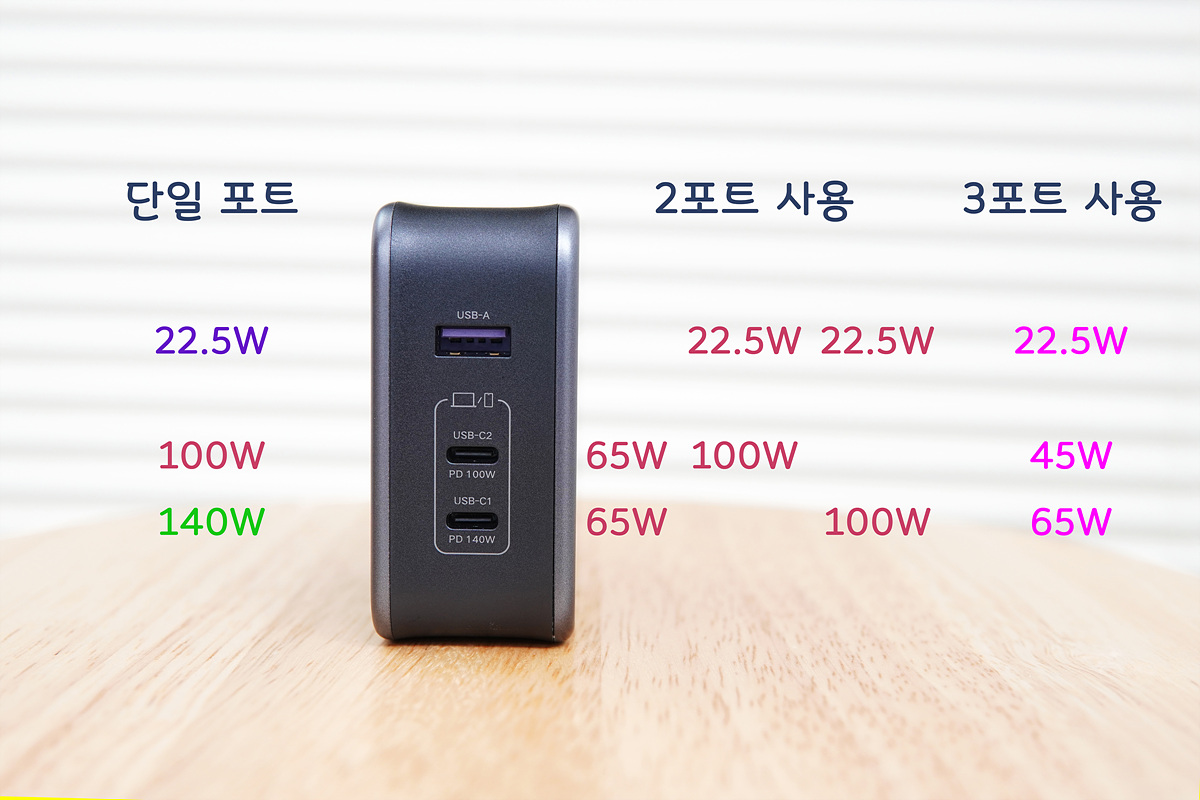 최대 출력은 140W이고 Type-C 포트를 단독으로 사용할 때는 최대 140W / 100W로 16인치 맥북 프로에서도 사용할 수 있으며 그 밖에 다른 노트북도 충전이 가능합니다. 그 밖에도 맥북(프로 / 에어)이나 삼성 갤럭시북, LG 그램과 같은 노트북 두 대를 Type-C 포트에 연결해도 각각 65W로 충전을 할 수 있습니다.