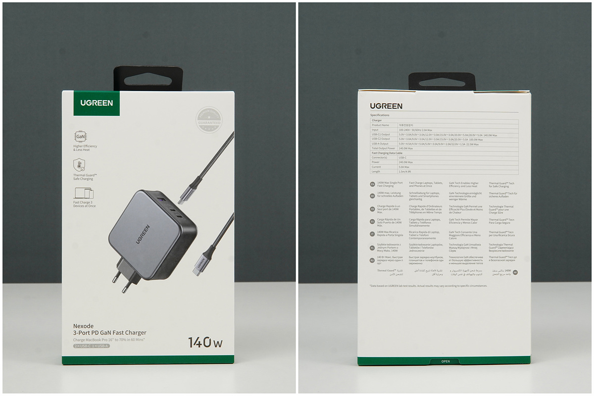 유그린 140W GaN2 PD3.1 멀티 충전기는 이름에서 알 수 있듯이 최대 130W의 출력을 가지고 있으며 가장 최근에 지정이 된 PD 3.1을 지원하고 있습니다. 포트는 Type-C 두 개와 A 한 개로 이루어져 있으며 질화갈륨(GaN2)으로 충전기의 크기 역시 작은 편입니다. 규격만 본다면 가장 채신기술(규격)은 다 적용됐다고 볼 수 있으니 실제 모습이나 충전 테스트를 해보도록 하겠습니다.
