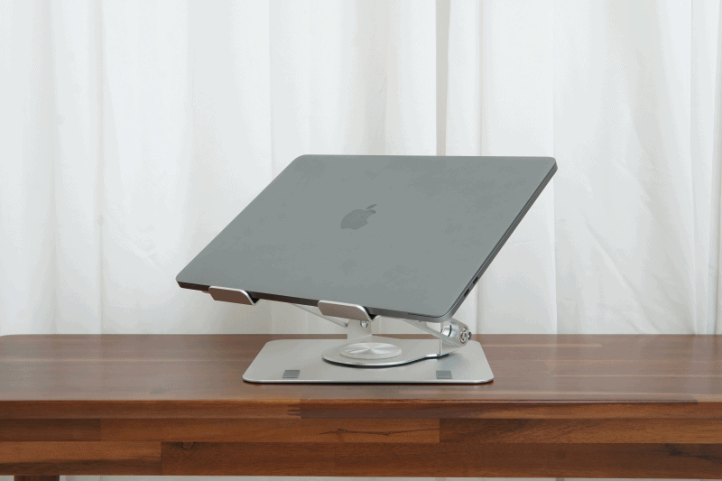 각도를 틀어야 할 때는 노트북과 스탠드를 들어서 바꿀 필요 없이 편리하게 회전을 할 수 있습니다. 회전할 때는 일정 각도마다 걸림이 있는 래칫 방식으로 조절이 되며 이때는 딸각하는 소리가 나서 이 부분은 호불호가 나뉠 거 같습니다. (아래 영상에서 다시 다루도록 하겠습니다.)