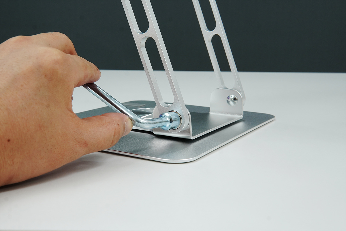 기본 구성품에 포함되어 있는 육각 렌치로 관절의 텐션(강도)을 조절할 수 있지만 기본 상태에서도 좀 강하게 되어있어서 딱히 조절할 필요는 없을 거 같습니다. 노트북을 올려놓은 상태로 고정해야 되니 다소 힘을 줘서 조절할 수 있는 상태가 좀 더 안전하겠죠.