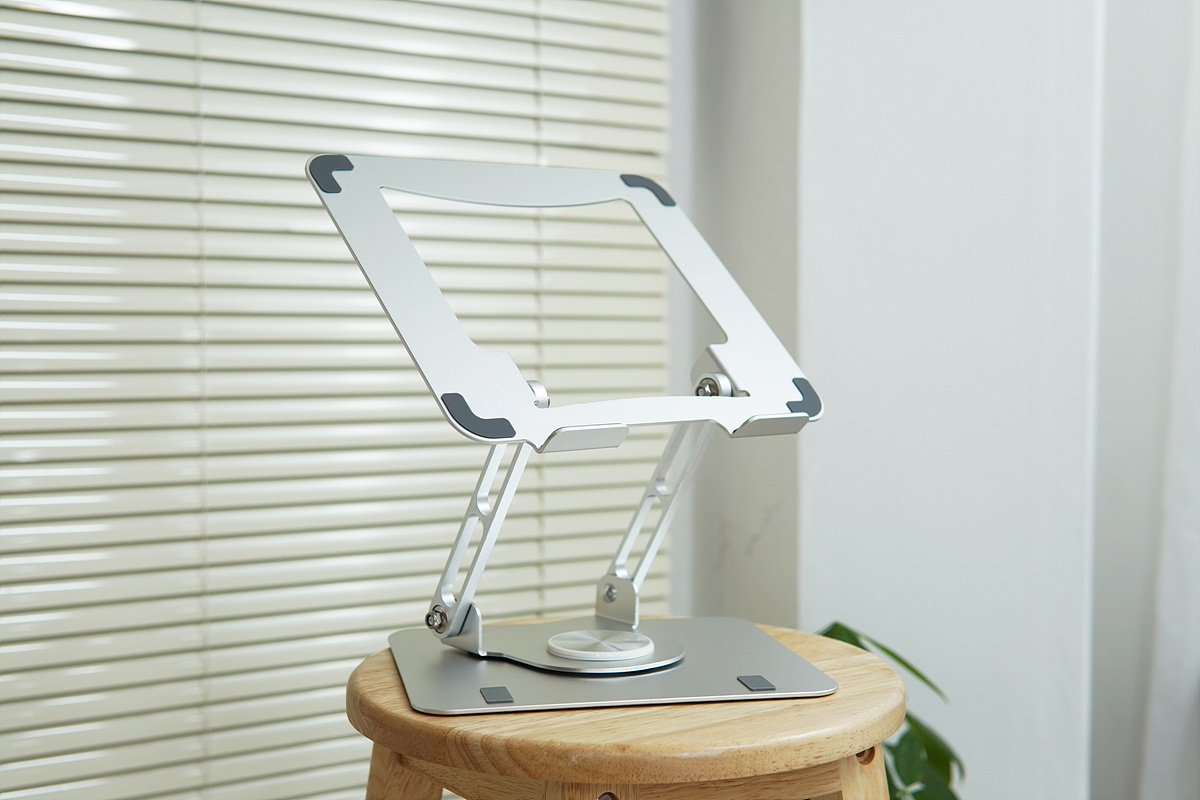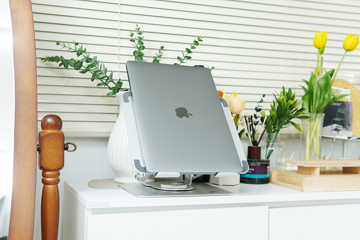 다소 힘을 줘서 조절을 해야 되는 관절에 비해 회전은 부드럽게 조절할 수 있습니다. 언뜻 생각해 보면 노트북 스탠드를 회전해서 쓸 일이 있을까?라고 생각할 수 있겠지만 사용하는 환경에 따라서는 모니터를 추가로 연결하거나 교재나 태블릿과 같은 기기를 동시에 사용할 경우라면 꽤나 편리하게 사용할 수 있습니다.