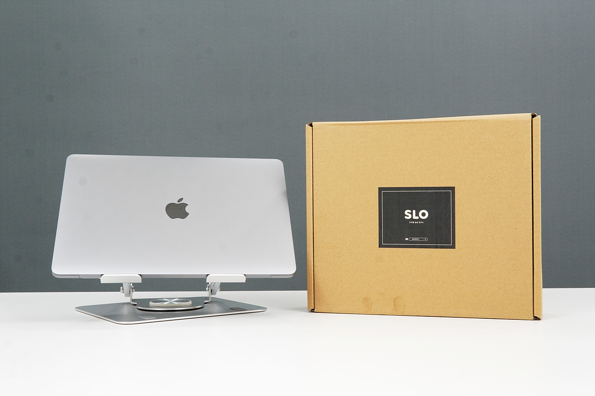 노트북을 오랜 시간 사용하게 되면 화면이나 키보드의 위치 때문에 어깨나 목이 금방 피로해지고 자세도 틀어져서 거북목 증후군이 발병할 확률이 높아지게 됩니다. 이런 이유로 노트북 스탠드(노트북 거치대)를 사용하게 되는데 현재 판매되는 제품의 종류는 꽤 많은 편이지만 대부분의 제품들은 비슷한 모양과 특정 위치(높이와 각도)에서만 사용하게 됩니다. 위치 조절을 좀 더 편하게 하기 위해서는 모니터 암과 연결해서 사용할 수도 있지만 설치 장소(책상)에 대한 제약은 물론 가지고 다닐 수 없다는 단점이 있죠. 이번에 소개하는 슬로 360도 회전형 노트북 스탠드는 단순히 노트북의 높이와 각도뿐 아니라 제품의 이름처럼 스탠드를 회전해서 사용할 수 있습니다.