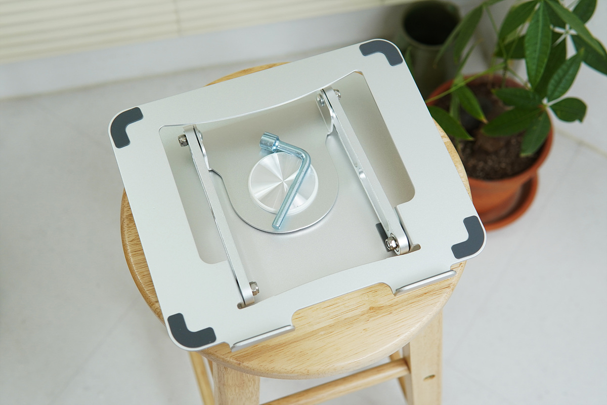 다소 힘을 줘서 조절을 해야 되는 관절에 비해 회전은 부드럽게 조절할 수 있습니다. 언뜻 생각해 보면 노트북 스탠드를 회전해서 쓸 일이 있을까?라고 생각할 수 있겠지만 사용하는 환경에 따라서는 모니터를 추가로 연결하거나 교재나 태블릿과 같은 기기를 동시에 사용할 경우라면 꽤나 편리하게 사용할 수 있습니다.