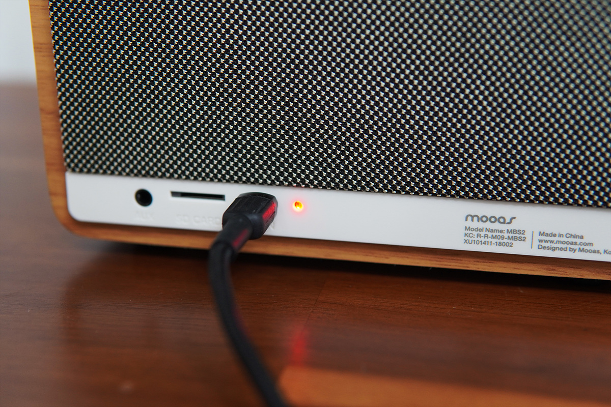 스피커 앞쪽에는 풀레인지(Full Range) 유닛 한 개와 라디오 주파수를 바꿀 수 있는 큼지막한 아날로그 방식의 다이얼이 있습니다. 어릴 때 라디오를 자주 들었던 분들이라면 꽤나 반가울만한 다이얼이고 레트로(Retro) 감성이 물씬 풍기는 디자인은 정말 칭찬을 해주고 싶습니다. 중간에는 볼륨과 모드(블루투스, FM, SD, AUX) 를 바꿀 수 있는 노브가 있습니다. 라디오 주파수 다이얼과 볼륨 조절 노브(knob)는 약간 묵직하게 돌아가는데 이 부분은 조작감뿐 아니라 미세하게 조절해야 되는 기능에서도 좋은 효과를 보여줍니다.