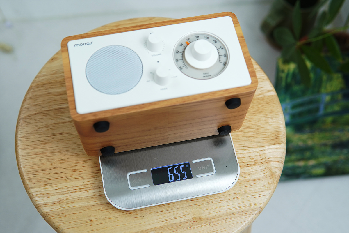 스피커 앞쪽에는 풀레인지(Full Range) 유닛 한 개와 라디오 주파수를 바꿀 수 있는 큼지막한 아날로그 방식의 다이얼이 있습니다. 어릴 때 라디오를 자주 들었던 분들이라면 꽤나 반가울만한 다이얼이고 레트로(Retro) 감성이 물씬 풍기는 디자인은 정말 칭찬을 해주고 싶습니다. 중간에는 볼륨과 모드(블루투스, FM, SD, AUX) 를 바꿀 수 있는 노브가 있습니다. 라디오 주파수 다이얼과 볼륨 조절 노브(knob)는 약간 묵직하게 돌아가는데 이 부분은 조작감뿐 아니라 미세하게 조절해야 되는 기능에서도 좋은 효과를 보여줍니다.