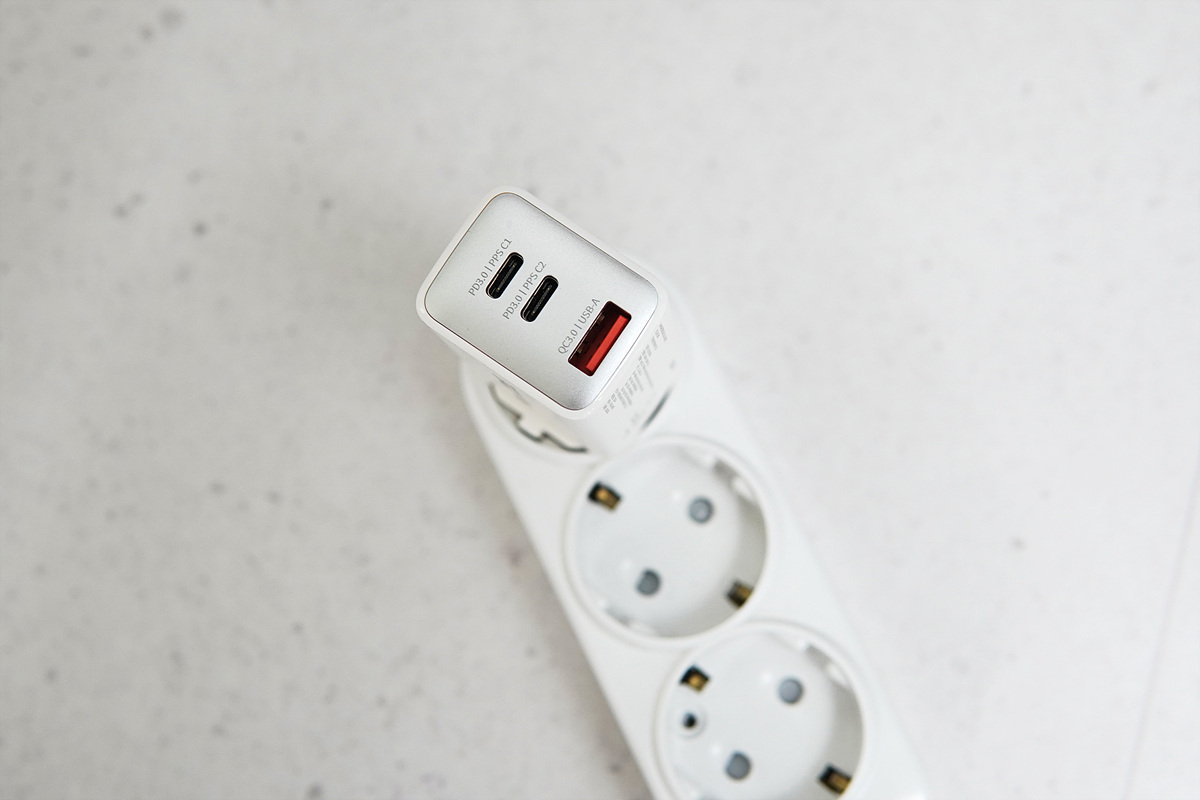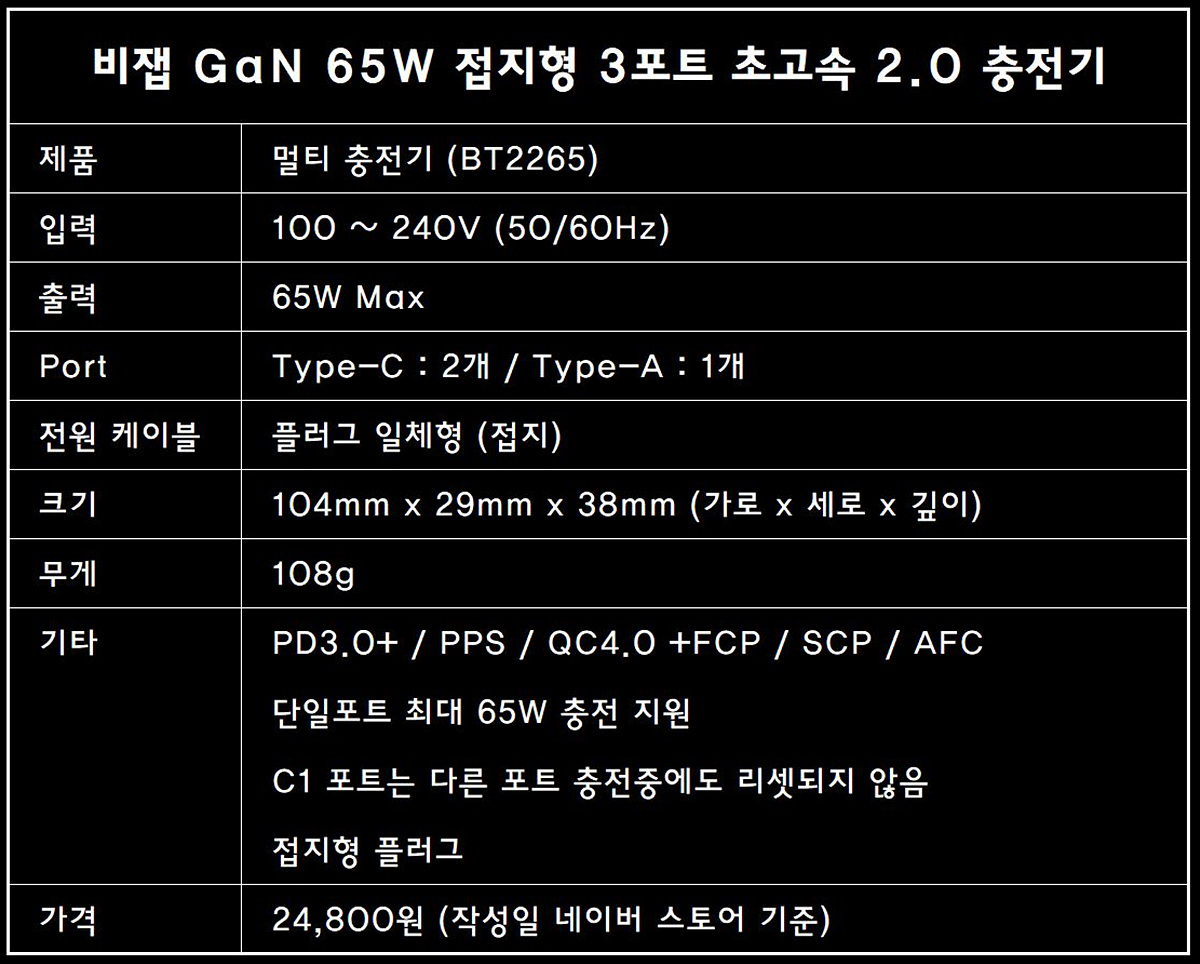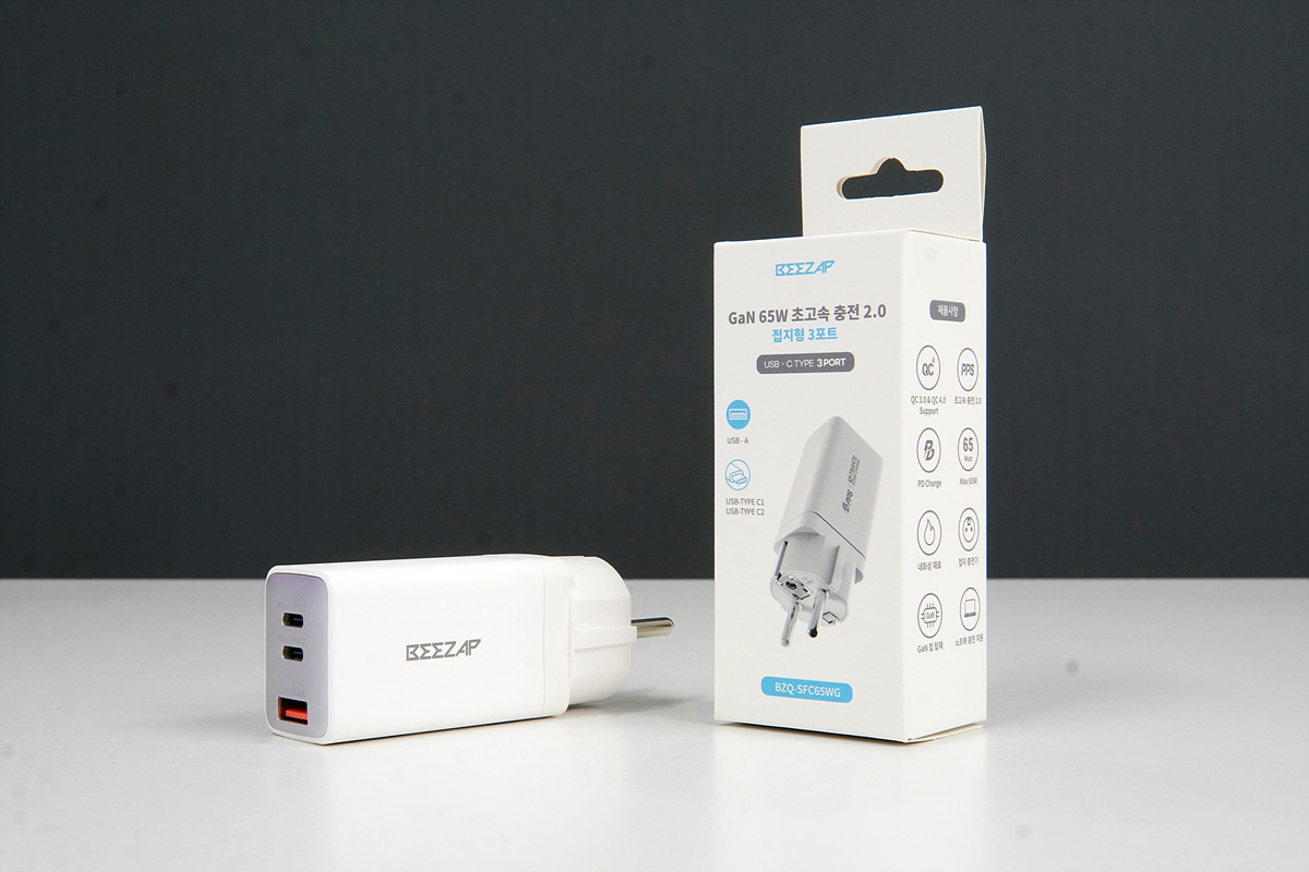 비잽 접지형 65W 멀티충전기는 집이나 사무실뿐 아니라 휴가나 출장을 갈 때 가방에 넣어도 전혀 부담이 없는 작은 크기로 Type-C 두 개와 Type-A 포트 한 개로 총 3개의 포트를 가지고 있습니다. 제품의 이름에서 전체 출력(65W)과 접지를 지원 하는 걸 알 수 있습니다. 접지(Ground)가 없다고 해도 충전이 안되거나 속도가 느려지는 건 아니지만 전자 기기에서 가장 중요한 부분 중 하나로 충전기에서 꼭 필요한 기능이라 생각합니다.
