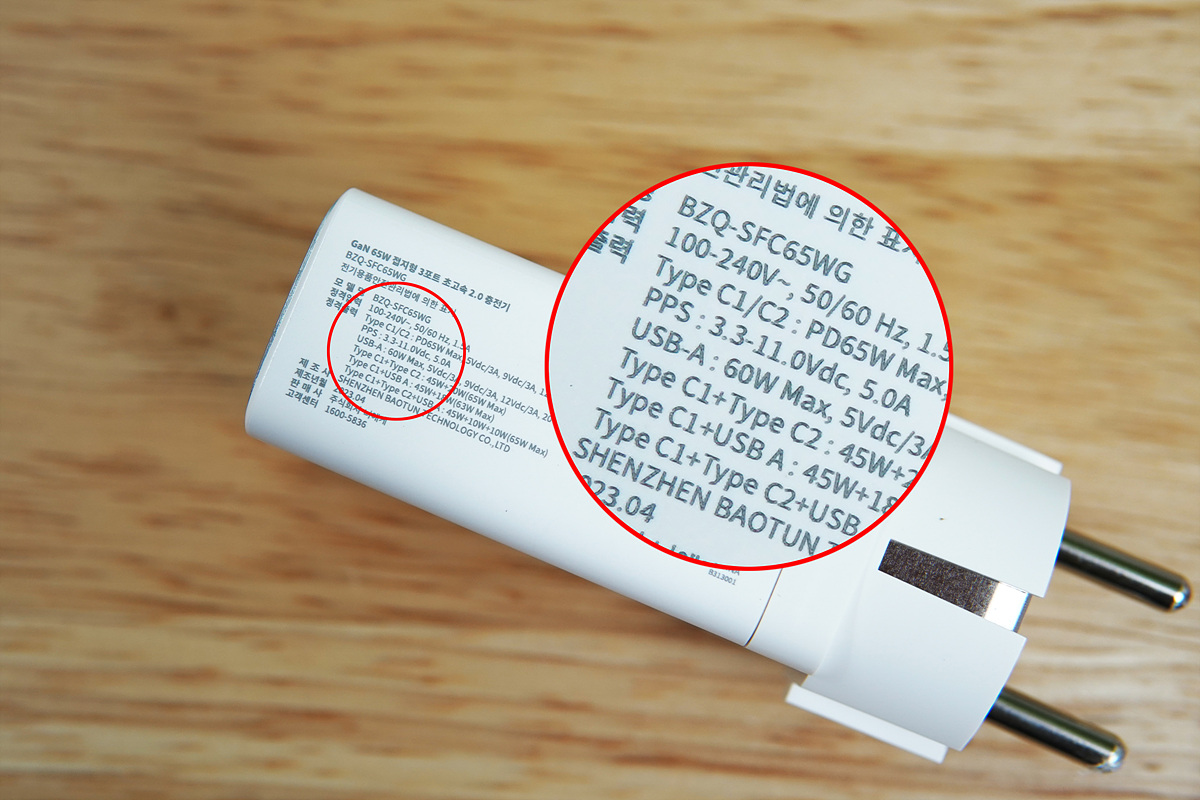 위쪽부터 C1, C2, A포트로 단독은 물론 3개 포트를 동시에 충전할 수 있으며 사용되는 기기의 개수와 위치(포트)에 따라서 출력이 자동으로 조절되고 이 부분 역시 충전기에 표시가 되어있습니다.