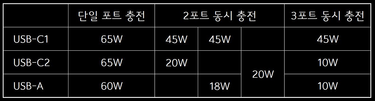 사용 포트별 출력을 표로 정리를 했습니다. USB A 포트의 단일 출력이 60W로 꽤 높은 편이며 C1 포트는 2개 3개의 기기를 연결해도 45W의 출력으로 맥북이나 일반적인 노트북을 충전도 가능합니다. 또한 C1 포트는 C2, A 포트를 사용하더라도 충전이 일시 중단되는 리셋 현상이 없으므로 편리하게 사용할 수 있습니다. 저는 리셋되는 게 딱히 불편하지 않았는데 저와는 다르게 이런 기능을 불편해하는 분들이 의외로 많더군요.