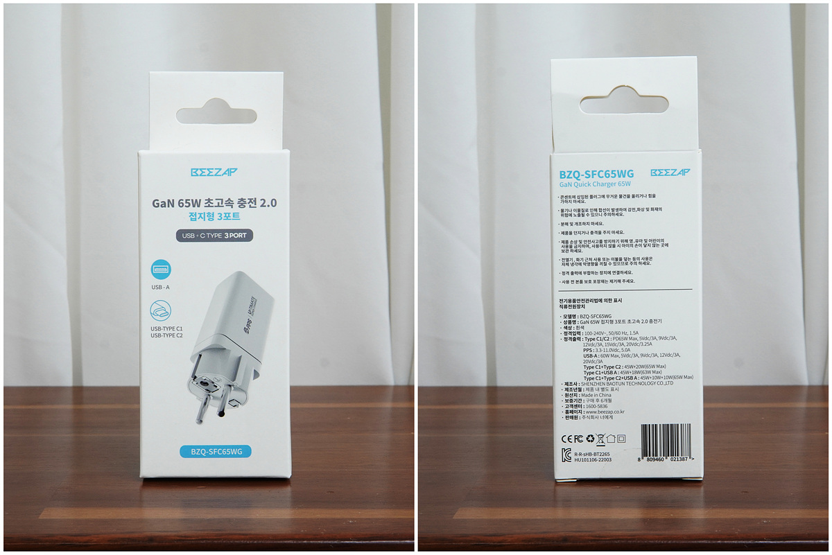비잽 접지형 65W 멀티충전기는 집이나 사무실뿐 아니라 휴가나 출장을 갈 때 가방에 넣어도 전혀 부담이 없는 작은 크기로 Type-C 두 개와 Type-A 포트 한 개로 총 3개의 포트를 가지고 있습니다. 제품의 이름에서 전체 출력(65W)과 접지를 지원 하는 걸 알 수 있습니다. 접지(Ground)가 없다고 해도 충전이 안되거나 속도가 느려지는 건 아니지만 전자 기기에서 가장 중요한 부분 중 하나로 충전기에서 꼭 필요한 기능이라 생각합니다.