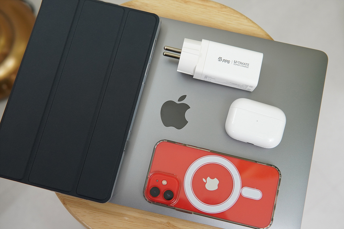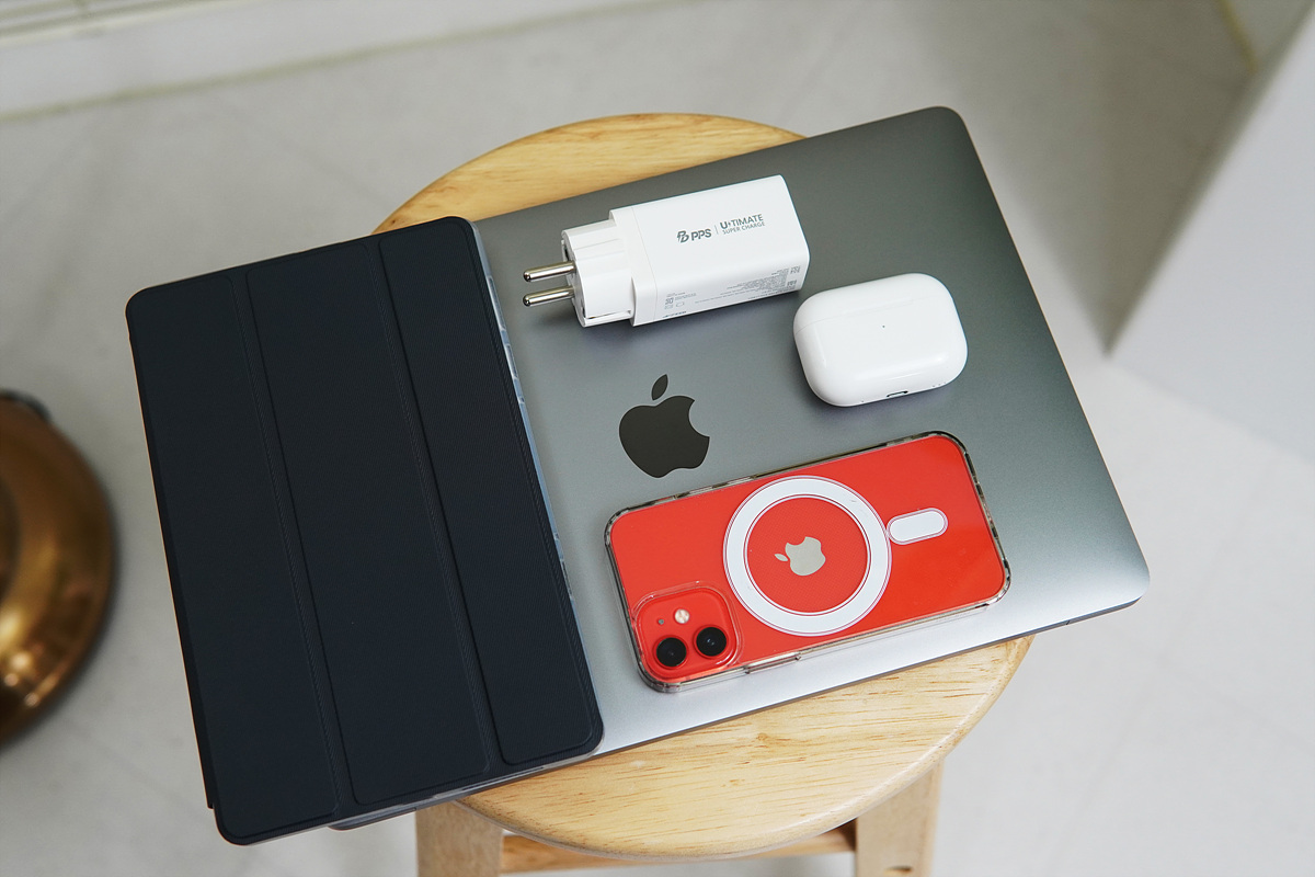 충전 테스트에 사용할 기기는 맥북 프로(13" M1), 레노버 Y700, 아이폰 12 미니와 에어팟 프로2 총 4대로 아이폰과 에어팟은 USB Type-A 포트에 무선 충전기를 연결해서 동시 충전을 했습니다.