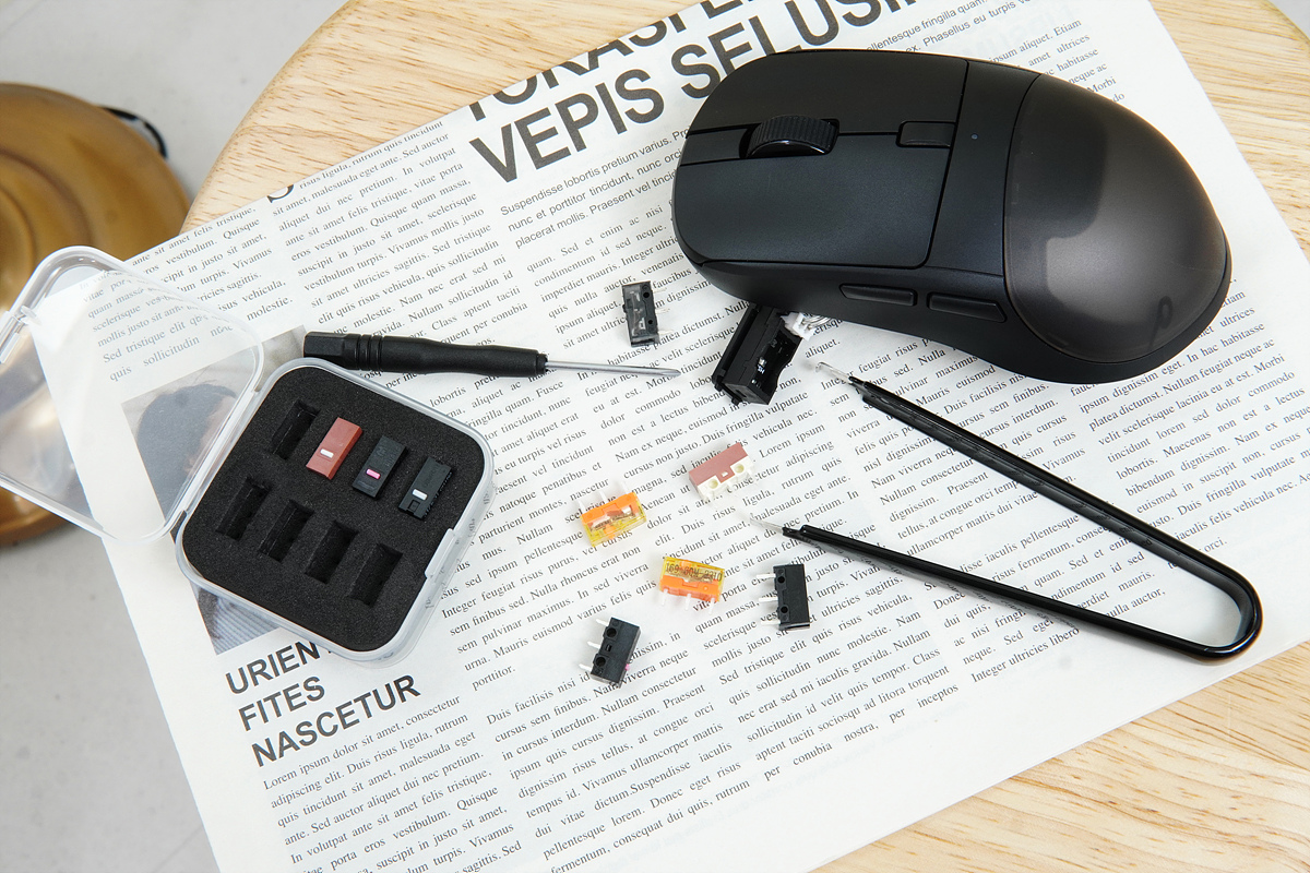 TITAN GC 게이밍 마우스의 가장 큰 특징이라면 좌우 스위치를 교체와 스위치의 변경 없이도 클릭 압력을 조절할 수 있는 기능인데 이 두 가지는 구성품에 포함된 도구들로 누구나 쉽게 세팅할 수 있습니다.