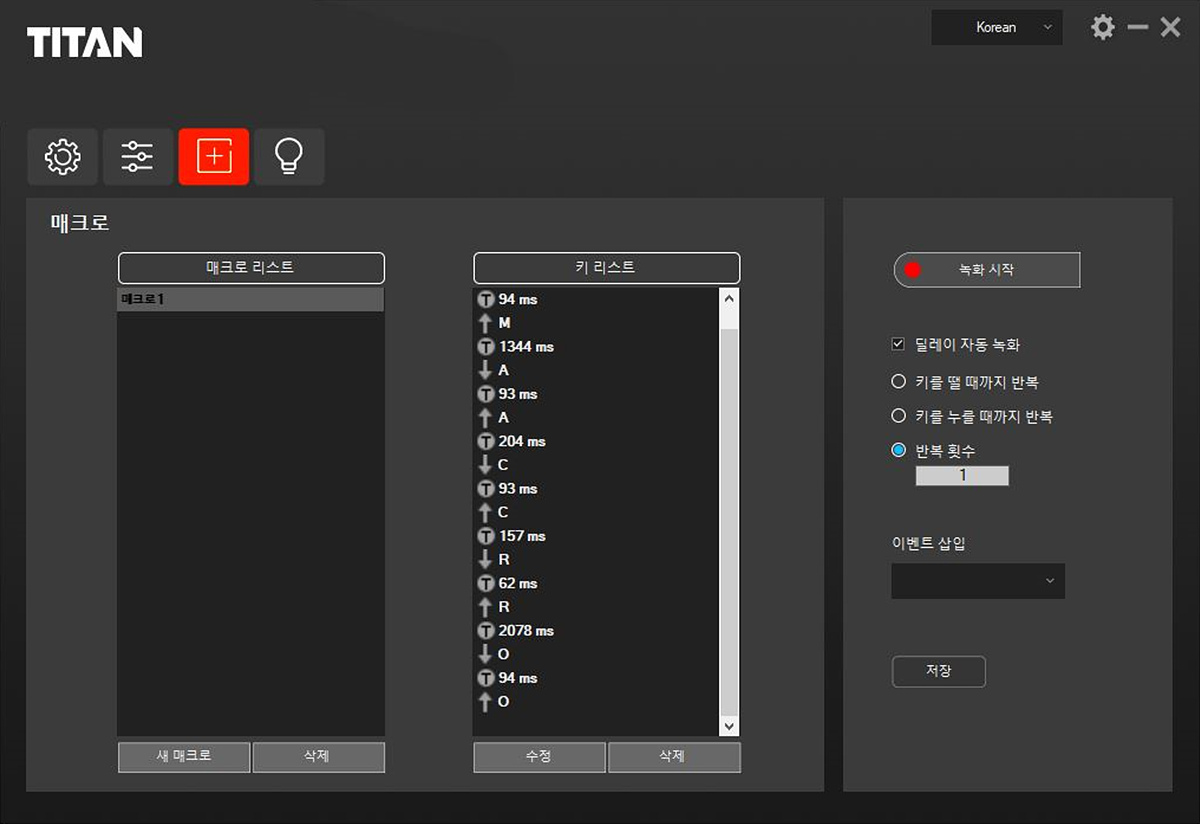매크로는 키 입력 시간을 조절할 수 있으며 다른 버튼으로 매크로 키를 할당해야 사용할 수 있습니다.