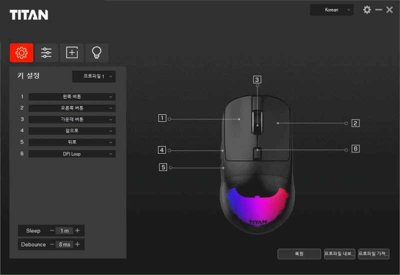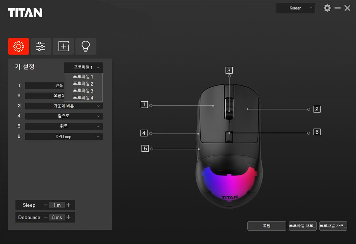 프로파일은 4개를 설정할 수 있으며 따로 저장이나 불러오기도 가능합니다. 왼쪽 아래에는 Sleep(절전 모드)와 클릭할 때의 반응 속도를 조절할 수 있는 디바운스 입력 시간을 조절할 수 있습니다. 디바운스 시간을 너무 짧게 하면 더블클릭을 인식하지 못하게 되니 조심해야 합니다.