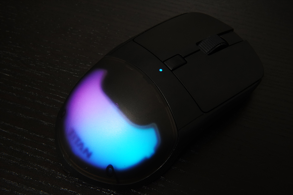 마우스 뒤쪽에서 RGB와 DPI에 따른 LED를 확인할 수 있습니다. 배터리를 사용하는 무선의 특성에 따라 RGB LED는 아주 화려하지는 않습니다. 추가 커버를 사용하면 LED가 표현되는 부분을 막을 수도 있고 엄지(앞으로 가기)와 휠 버튼을 2-3초간 누르고 있으면 LED를 끌 수도 있습니다.