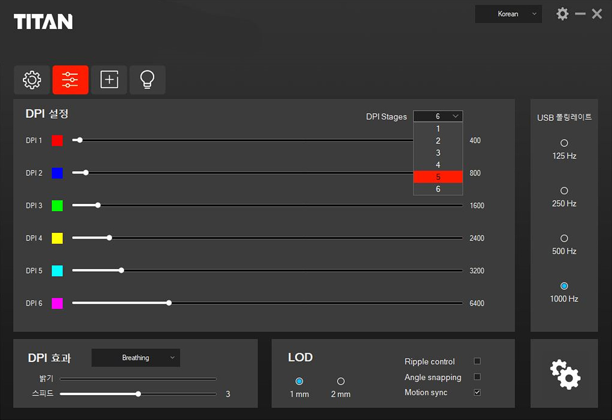 DPI 단계와 해당 색뿐 아니라 LED의 모드 역시 바꿀 수 있습니다.