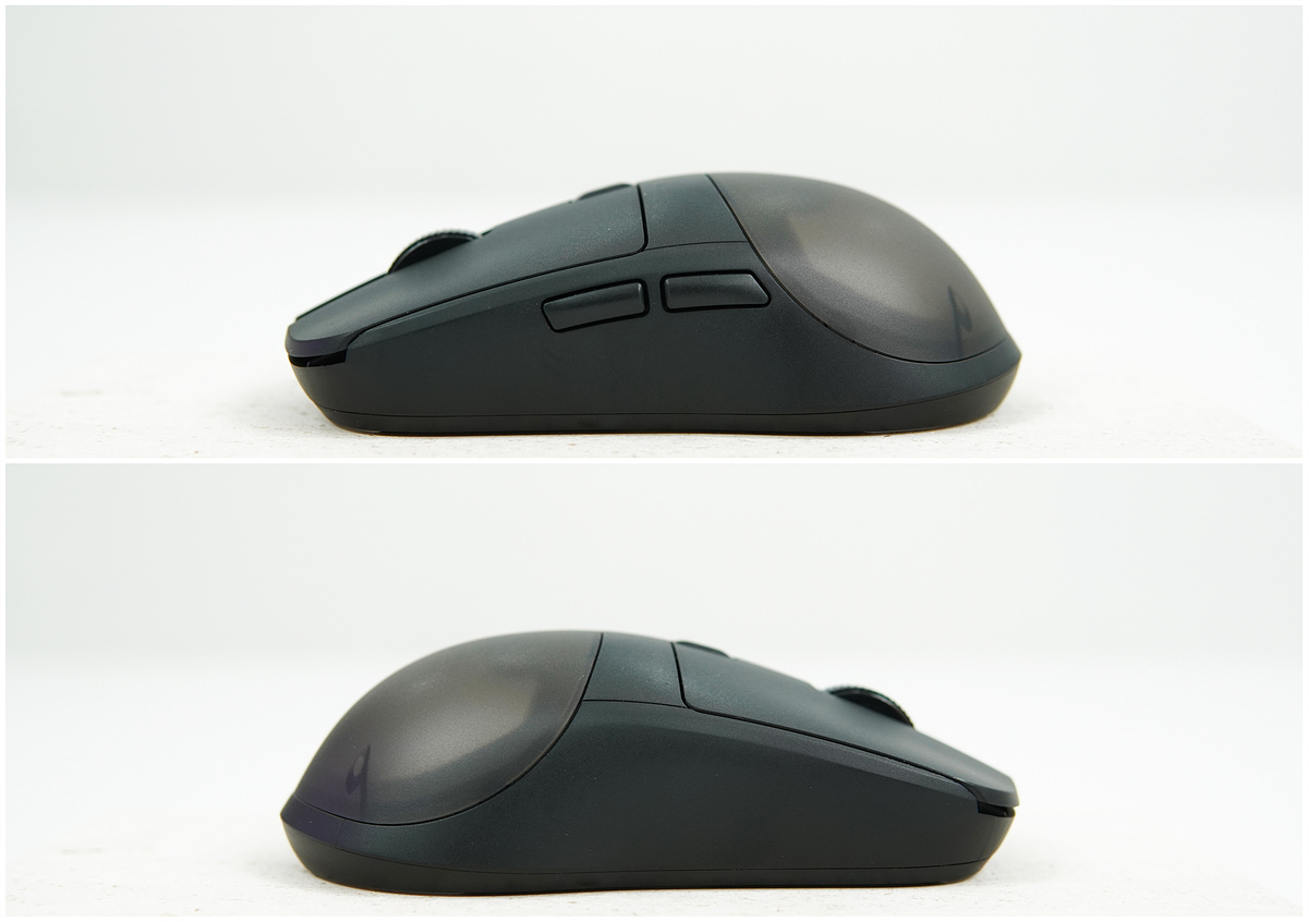 전체적인 뒤쪽으로 완만하게 높아지면서 팜 그립 쪽으로는 좀 더 경사가 있는 모양으로 일반적인 게이밍 마우스의 디자인입니다. 기본 구성품 포함된 추가 그립으로 교체를 하면 경사도의 차이(2mm)를 느낄 수 있습니다.