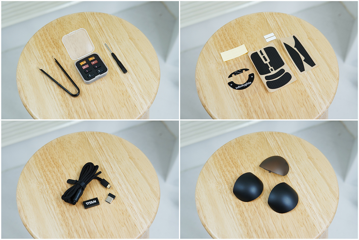 교체형 쉘(커버)도 넉넉하게 들어있고 파라코드 케이블과 C to A 젠더 그리고 그립 테이프등은 기존 타이탄 시리즈에서 각각 적용이 되었거나 추가로 구매를 할 수 있던 부품들인데 TITAN GC에서는 모두 기본 패키지로 포함이 되었습니다. 유리(Glass) 재질의 인피니티 글라이드는 이번에 처음으로 추가가 되었으며 이 제품의 가장 큰 특징이라고 할 수 있는 교체형 스위치도 무려 4쌍이나 들어있네요. 역대급 구성이라고 해도 될 거 같습니다.