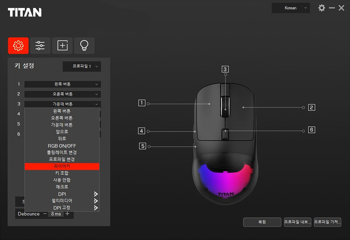 프로파일은 4개를 설정할 수 있으며 따로 저장이나 불러오기도 가능합니다. 왼쪽 아래에는 Sleep(절전 모드)와 클릭할 때의 반응 속도를 조절할 수 있는 디바운스 입력 시간을 조절할 수 있습니다. 디바운스 시간을 너무 짧게 하면 더블클릭을 인식하지 못하게 되니 조심해야 합니다.