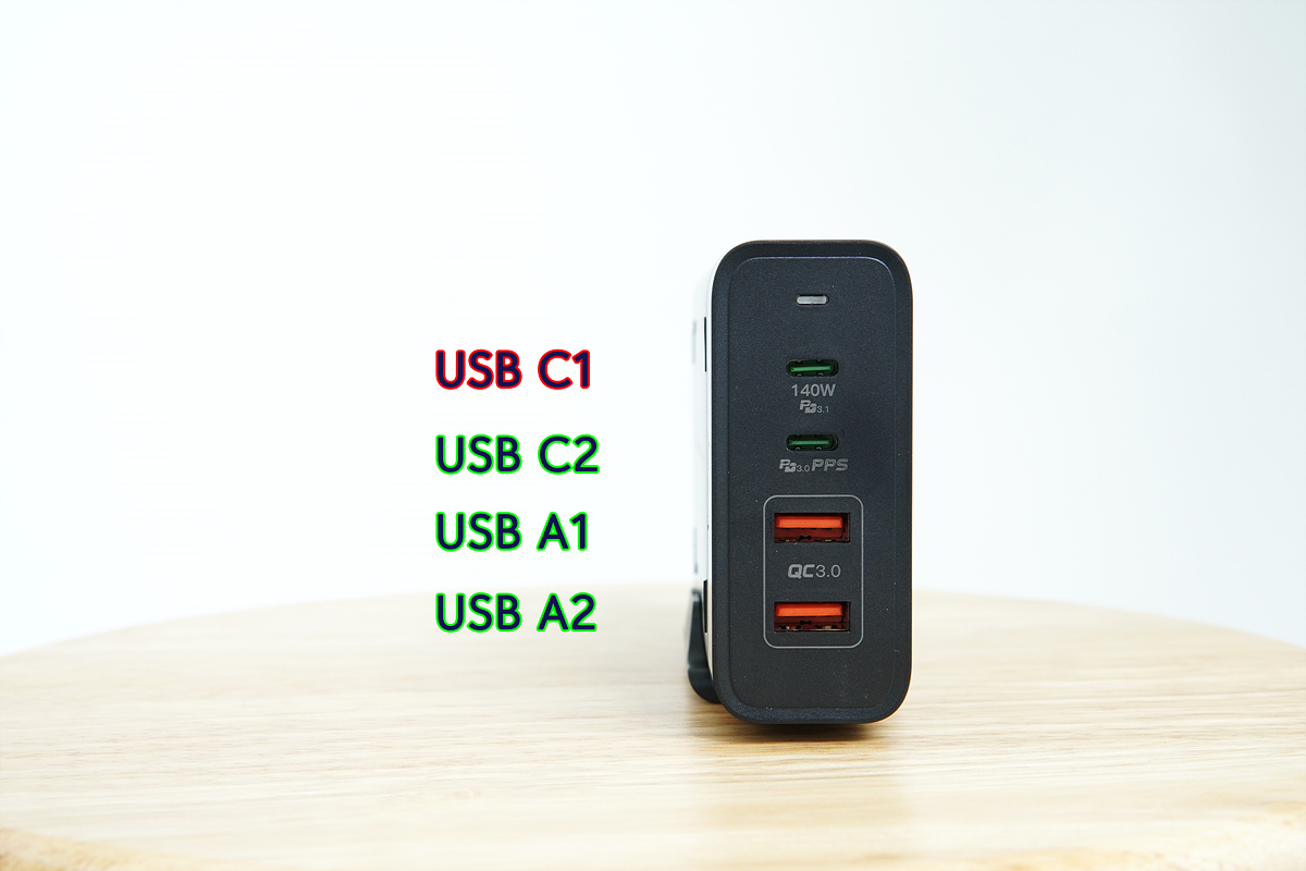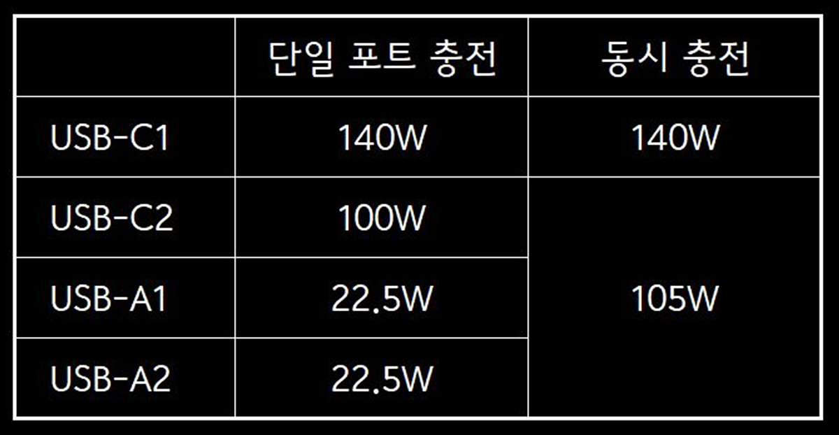 USB Type-C / A 포트는 각각 두 개씩 있으며 각각의 포트별 출력은 위 표와 같습니다. C1 포트는 단독으로 출력이 이루어져 다른 포트의 사용과 관계없이 140W의 높은 출력이 그대로 유지가 되며 다른 기기를 연결해도 충전중 리셋이 되지 않는다는 장점이 있습니다. 전체 포트를 사용할 때 각 포트의 최대 출력이 표시되어 있지는 않지만 예상을 한다면 C2은 60W 정도가 될 거 같네요. (60W + 22.5W + 22.5W)