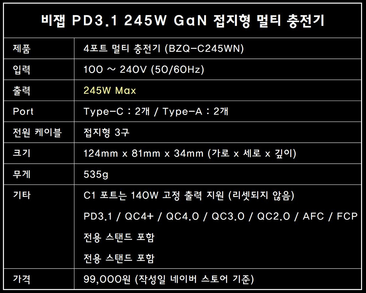 노트북이나 스마트폰을 구입할 때는 이것저것 따져봐야 될 게 상당히 많죠. 요즘은 충전기도 사용하는 노트북이나 태블릿의 충전 속도나 기기의 개수에 따라 따져봐야 될게 참 많습니다. 추가로 접지가 되는지 전체 출력이 아닌 각각의 포트별 출력도 확인을 해봐야 합니다. 이런 복잡한 거 잘 모르고 귀찮다면 그냥 비잽 245W 멀티 충전기 하나라면 어떤 기기라도 상관없이 원하는 속도로 빵빵하게 충전을 할 수 있습니다. 특히나 노트북을 두 대 이상 갖고 있는 사용자라면 묻지도 따지지도 않고 아무 걱정 없이 안심하고 사용할 수 있습니다.