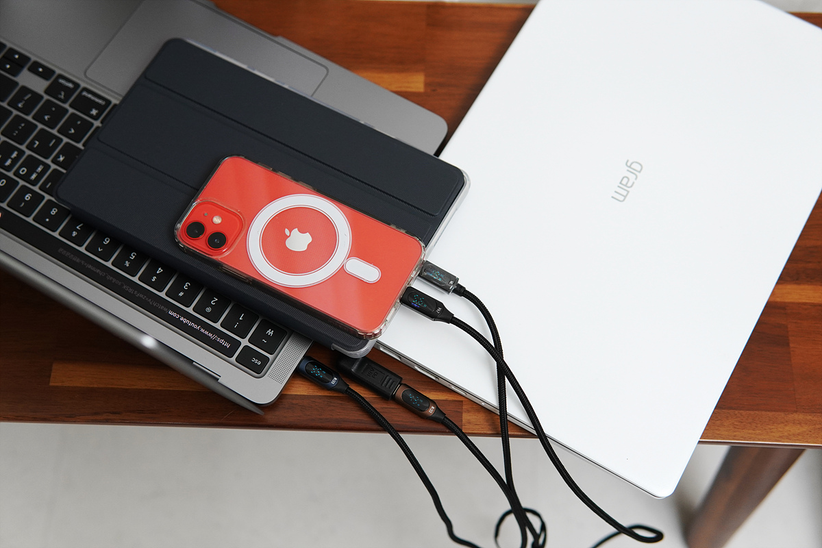 맥북 프로 13인치(m1), gram 노트북과 레노버 Y700 태블릿, 아이폰 12 미니로 충전 테스트를 했습니다.