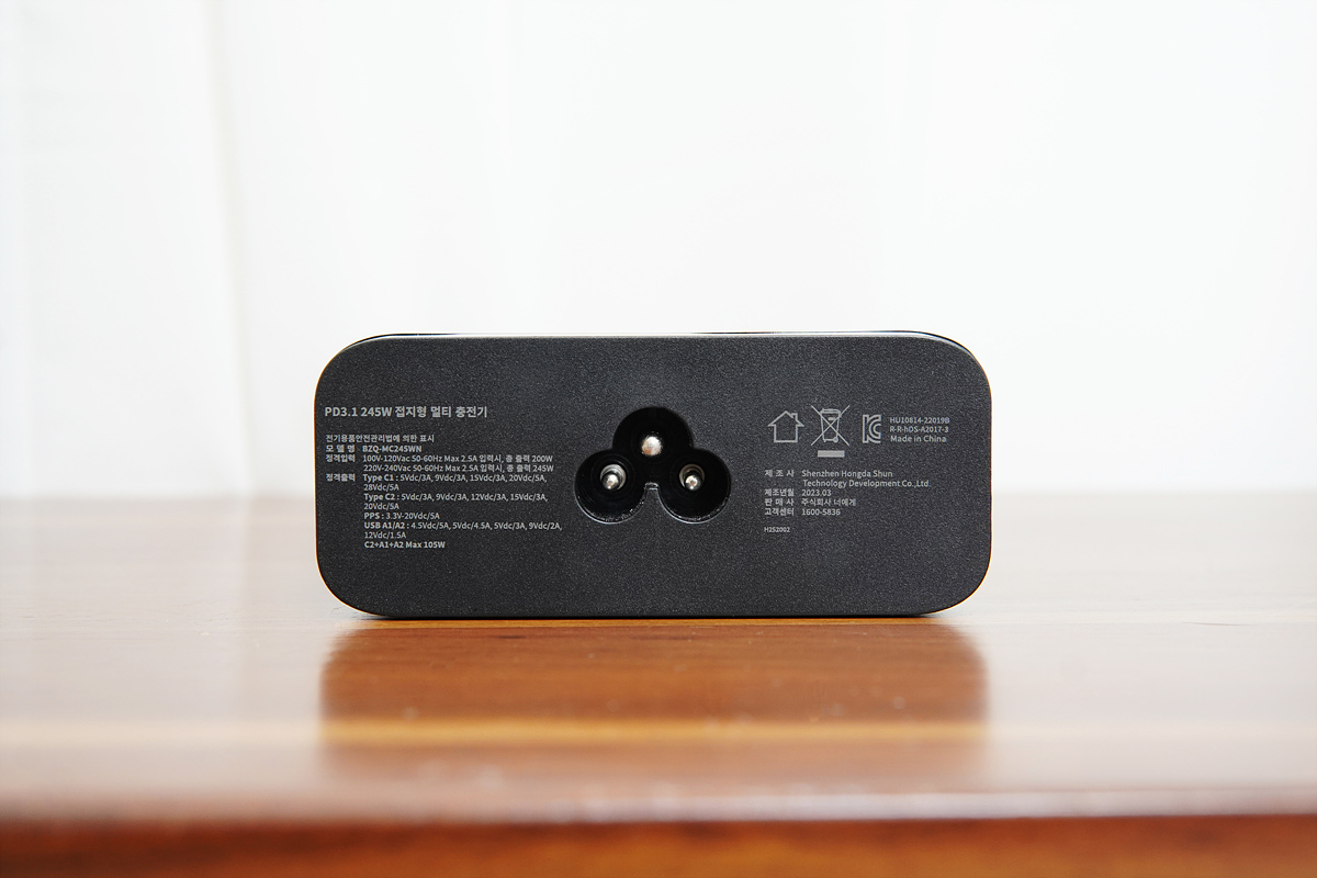 구성품은 충전기, 전원 케이블, 설명서와 스탠드로 이루어져 있습니다. 비잽 245W 멀티 충전기는 플러그 일체형이 아닌 전원 케이블을 따로 연결하는 방식인데 이런 제품의 경우 대부분 테이블이나 책상 위에 두고 사용을 하는데 세워서 사용한다면 스탠드는 정말 필요한 부품 중 하나입니다. 멀티 충전기가 처음 출시될 때는 이렇게 기본 구성품에 포함되는 제품들이 많았는데 이제는 이렇게 스탠드가 있는 제품이 드문 편입니다.