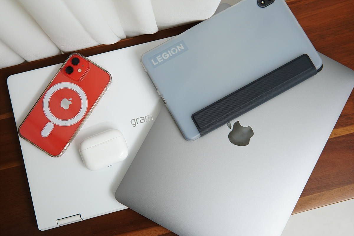 맥북 프로 13인치(m1), gram 노트북과 레노버 Y700 태블릿, 아이폰 12 미니로 충전 테스트를 했습니다.