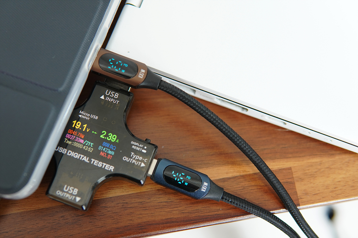 C1 포트에 맥북 프로를 연결하면 40W ~ 60W로 충전이 이루어집니다. 충전을 할때는 출력이 고정되는 게 아닌 기기의 상태(배터리 잔량, 온도)에 따라서 계속해서 바뀌게 됩니다.