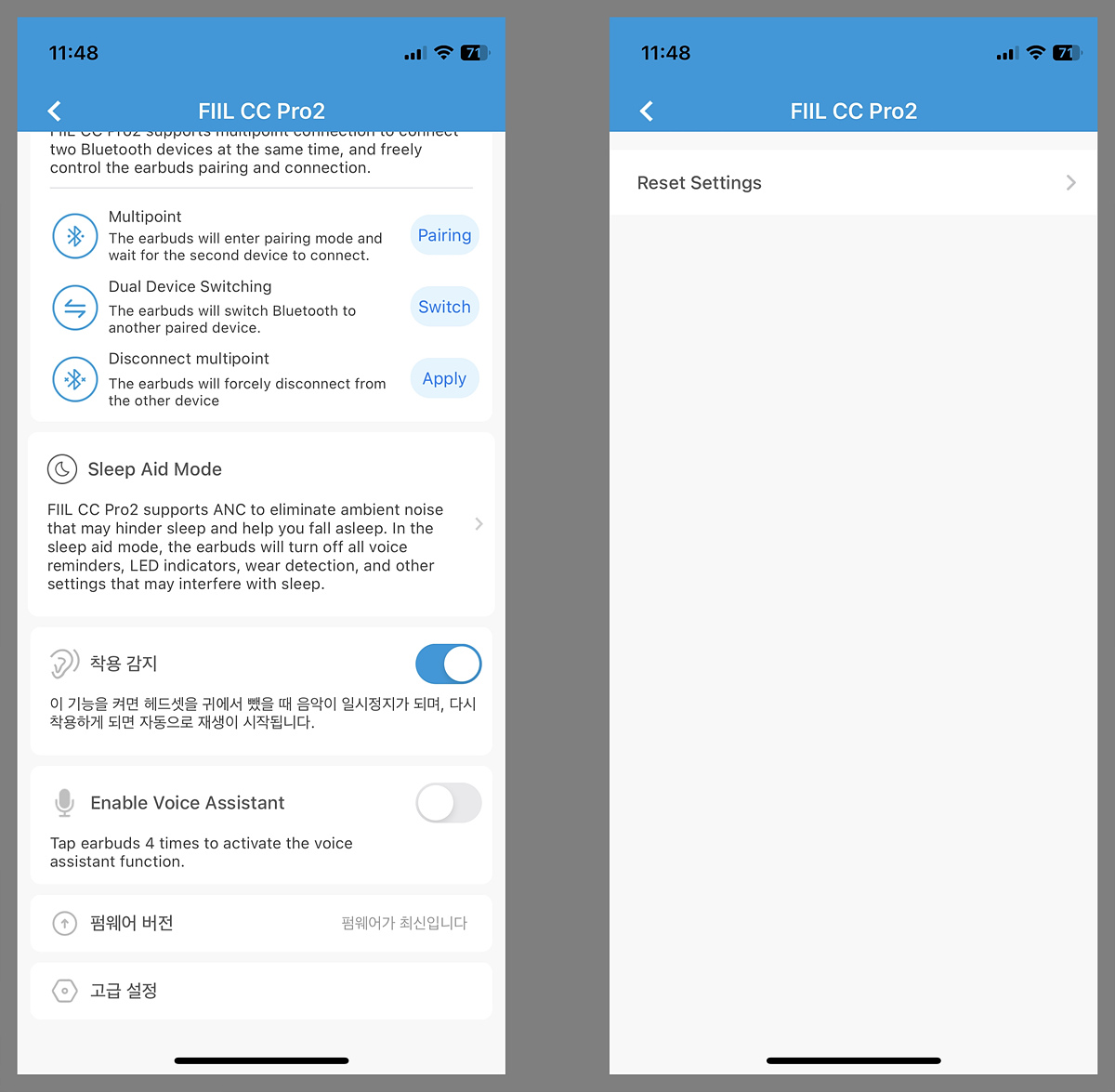 FIIL 블루투스 이어폰들의 장점 중 하나는 버튼의 기능을 사용자의 취향에 맞게 조절(커스텀)할 수 있는 부분인데 CC Pro2 역시 이런 기능이 포함이 되었으며 고음질(LDAC) 지원과 함께 두 대의 기기에 동시에 연결과 전환이 되는 멀티페어링을 사용할 수 있습니다. LDAC을 활성화하면 기기가 재부팅이 되며 이때는 멀티포인트를 사용할 수 없으니 꼭 확인하시기 바랍니다. 안드로이드 폰 한대를 사용하는 분들이라면 LDAC를 사용하는 게 좋겠지만 두 대의 폰이나 태블릿, 노트북, PC와 같이 사용하는 분들이라면 멀티포인트 기능을 사용하는 걸 추천합니다.