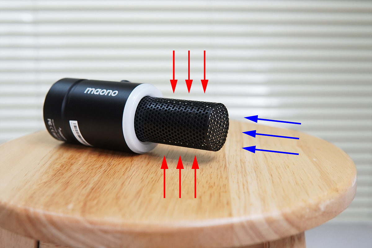 PD200X는 지향성(카디오이드) 방식의 다이나믹 마이크로 빨간색 방향으로 수음이 되기 때문에 사용자의 입과 방향을 맞추어야 합니다. 파란색으로 녹음하게 되면 측면 방향이라 수음이 거의 이루어지지 않습니다.