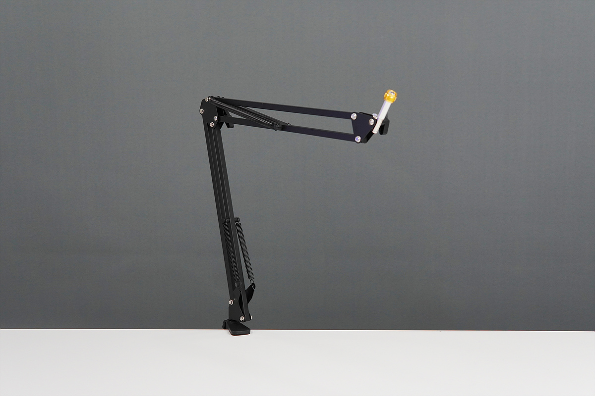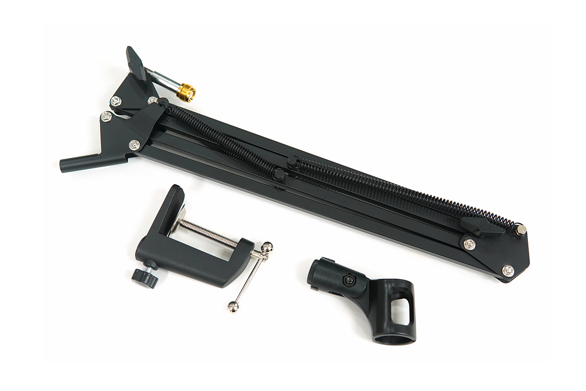마이크 암(스탠드)은 보급형이라 스프링 방식으로 되어있으며 책상 상판에 고정할 수 있는 클램프 방식으로 되어있습니다. 클램프 방식이 불편하거나 사용할 수 없다면 거치형 방식의 스탠드를 사용하셔도 됩니다. 핸드헬드 방식의 마이크가 아니라면 이런 스탠드는 무조건 필수입니다.