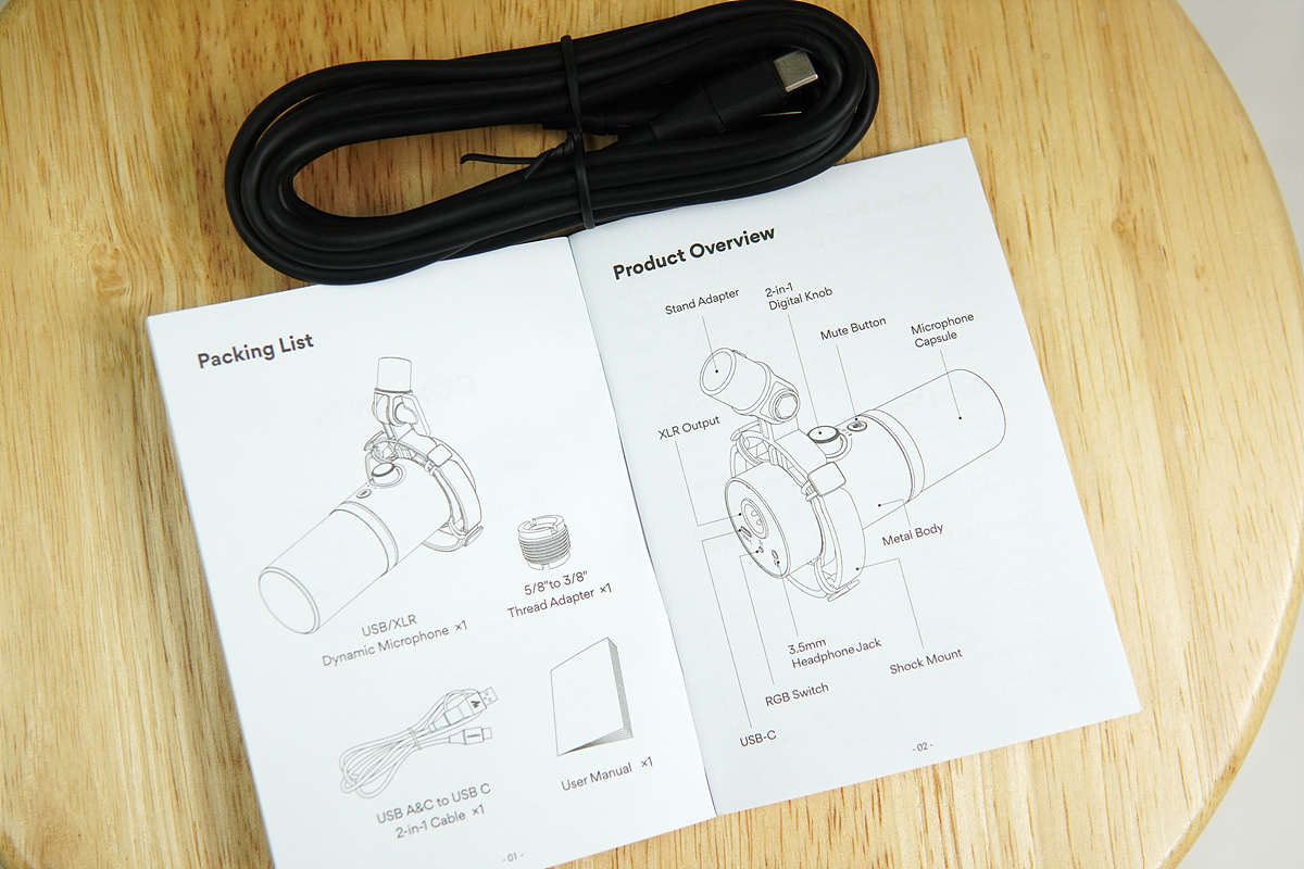 구성품은 마이크, 쇼크 마운트, USB 케이블, 사용자 설명서와 5/8" to 3/8" 변환 어댑터로 이루어져 있습니다. 마이크와 쇼크 마운트는 결합이 되어있고 내부에는 스펀지로 안전하게 포장되어 있습니다.
