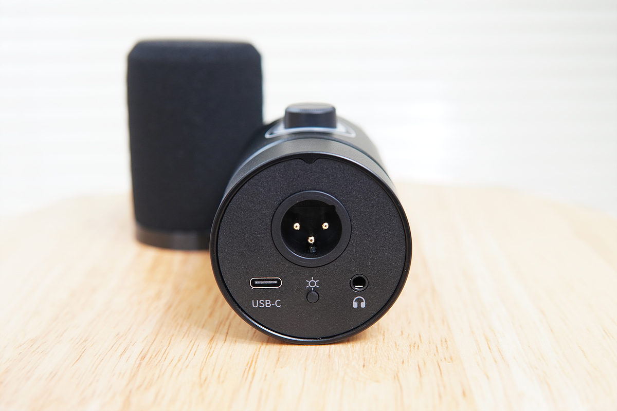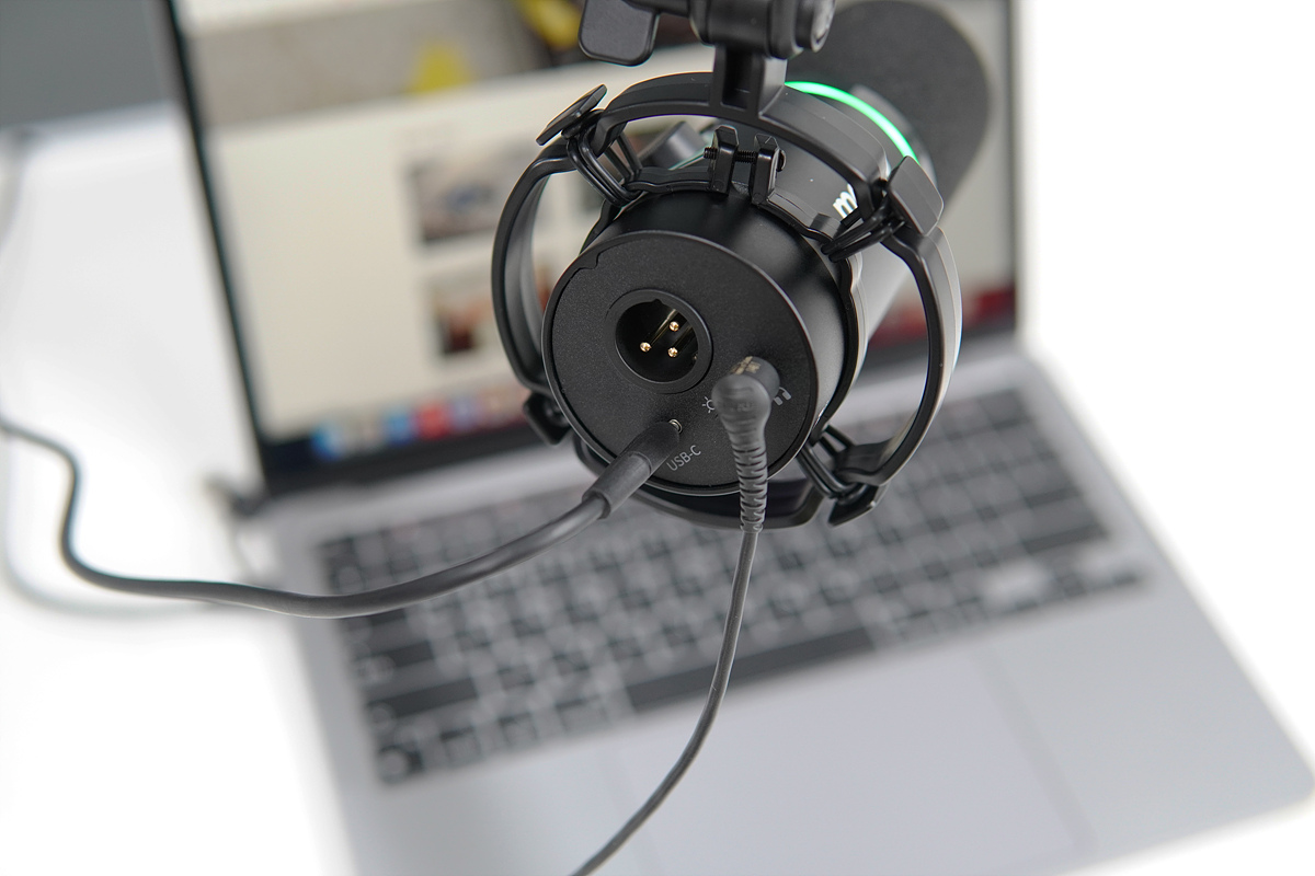 마이크 바닥(뒤쪽)에는 XLR, USB Type-C, LED 변경 버튼과 3.5mm 모니터링 단자가 있습니다. 모니터링 단자는 변환 젠더가 필요 없이 3핀과 4핀 모두 그대로 사용할 수 있습니다.