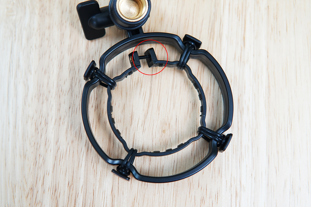 동그라미 부분의 나사를 조절하면 마이크와 쇼크 마운트를 분리할 수 있으며 고무로 마감된 케이블로 바닥에서 오는 진동을 확실히 억제하고 있습니다. 마이크를 사용할 때는 쇼크 마운트 역시 꼭 사용하는 걸 추천합니다. 녹음할 때는 잘 안 들리지만 나중에 결과물을 들어보면 사람들이 걸어 다니는 소리나 바닥에서 오는 진동이 같이 녹음돼서 이런 스트레스가 장난 아니더군요.