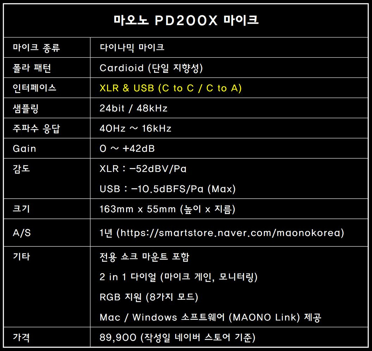 이번에 소개하는 마오노 PD200X는 이런 사용자들의 고민을 덜어줄 수 있는 제품으로 USB와 XLR 두 가지 연결을 모두 지원하고 있으며 9만 원의 가격으로 입문자들도 큰 부담 없이 구매할 수 있으며 마이크에 필수품인 마이크 암(스탠드)까지 같이 선택할 수 있는 일종의 RTR(Ready to Run) 세트라고 할 수 있는 제품입니다.