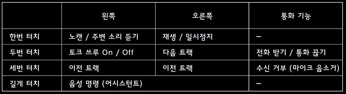 이어버드는 터치로 동작하며 좌/우 다르게 동작되고 전용 앱을 설치하면 통화 기능을 제외한 나머지 기능들은 사용자가 별도로 선택해서 바꿀 수 있습니다. 터치 감도는 괜찮았지만 반박자정도 느린 반응은 아쉽더군요.