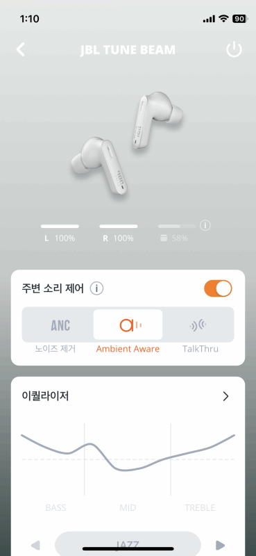 ANC (액티브 노이즈 캔슬링)와 주변 소리를 듣는 A,boemt Aware 모드 그리고 대화에 조금 더 집중하는 톡 쓰루 3가지를 선택할 수 있습니다. 보급형 라인이라 ANC는 크게 기대 하지 않았는데 제 기대보다는 좋은 성능이었습니다. 낮은 저역부터 중저역대까지 넓게 감쇄시켜주는건 아니지만 낮은 저대역의 소리는 꽤 줄여주고 있었으며 바람 소리의 억제 역시 만족스러운 수준이었습니다.
