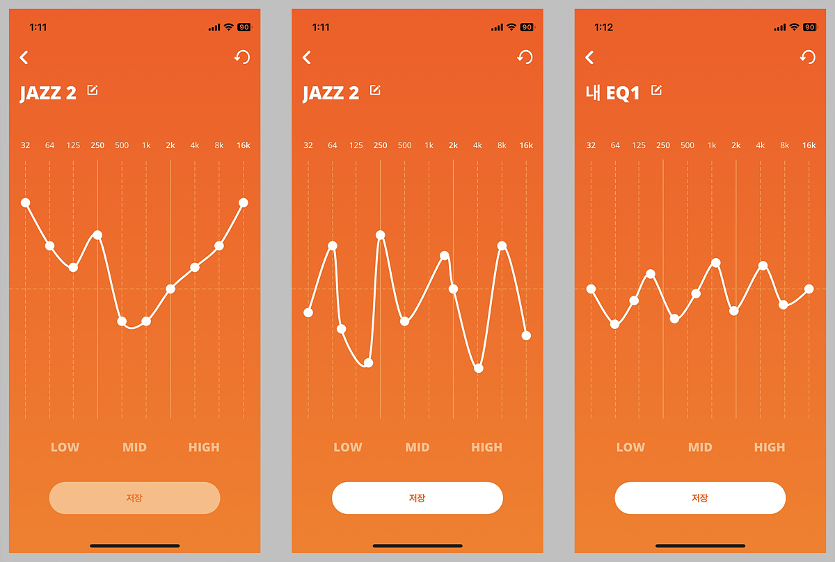 6개의 프리셋을 사용할 수 있으며 프리셋을 조금 수정해서 사용자 EQ로 만들 수도 있고 아예 처음부터 내가 원하는 값으로 세팅을 할 수도 있습니다. 저는 JAZZ와 BASS 프리셋 EQ 두 개를 추천합니다.