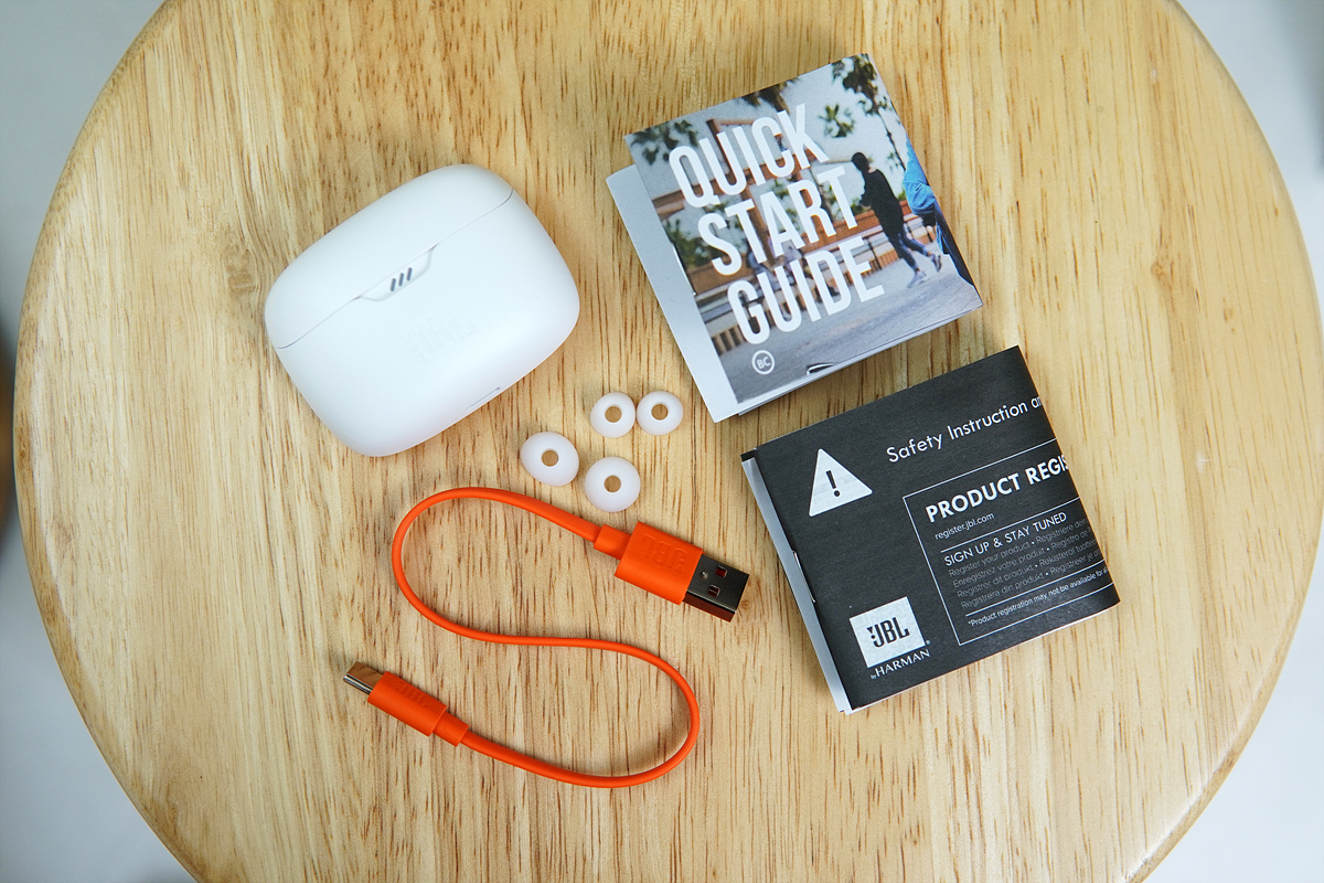 이어폰, 제품의 사용과 안전에 대한 설명서, 추가 이어팁 두 쌍과 충전용 케이블이 있는데 역시나 JBL 제품답게 오렌지 색으로 통일이 되어있습니다.