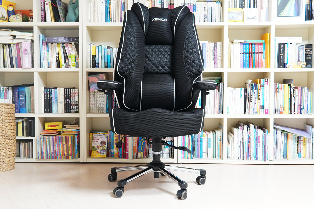 조립을 마치고 의자를 보면 약간은 웅장함(?)이 느껴집니다. 좌판과 등판의 크기뿐 아니라 양쪽의 쿠션 때문인지 크기가 상당한 편이라 작은 방에서 사용을 한다면 약간은 답답해 느껴질 수도 있습니다.