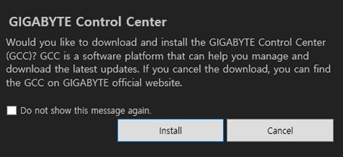 인터넷이 연결되어 있는 상태라면 부팅이 된 후 GCC(Gigabyte Control Center)에 대한 안내가 팝업됩니다. 구성품에서 드라이버 CD가 없지만 이 기능으로 쉽게 설치가 가능합니다.