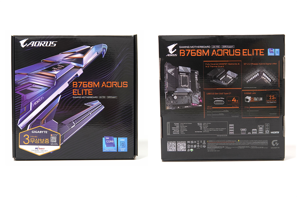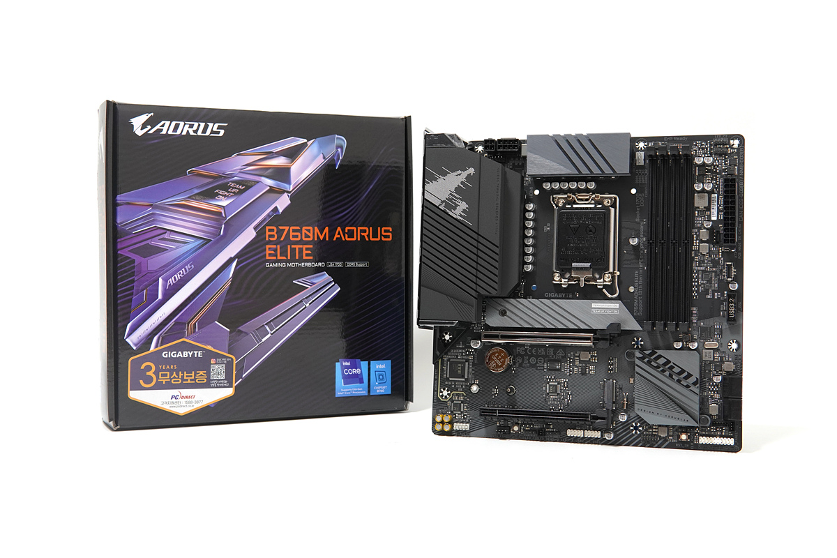 GIGABYTE B760M AORUS ELITE 피씨디렉트 메인보드는 B760M이라는 이름에서 알 수 있듯이 인텔의 12, 13세대 CPU를 사용할 수 있으며 mATX의 폼팩터(크기)를 가지고 있습니다. 기가바이트의 게이밍 브랜드인 어로스(AORUS)는 다양한 제품들이 있는데 엘리트(Elite)는 가장 막내인 보급형 라인의 제품입니다.