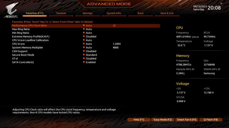 X.M.P로 한 번에 메모리의 클럭과 타이밍을 설정할 수 있습니다. 이전과 달리 B칩셋에서도 메모리의 오버는 가능하지만 요즘은 XMP 이외에 추가로 오버가 되는 폭이나 마진이 작기 때문에 XMP만 적용하게 되더군요. 스펙상 7,600MHz까지도 가능하지만 메모리나 CPU의 수율에 따라서 달라집니다.