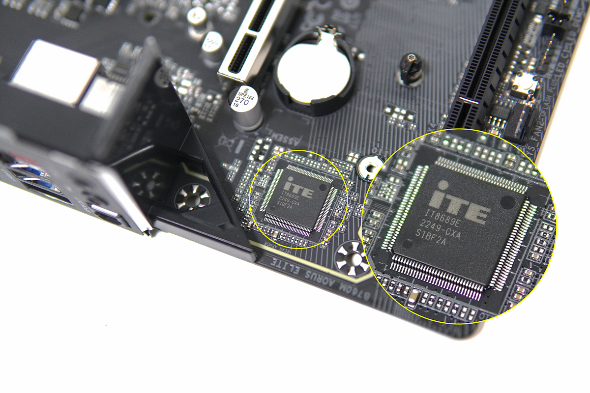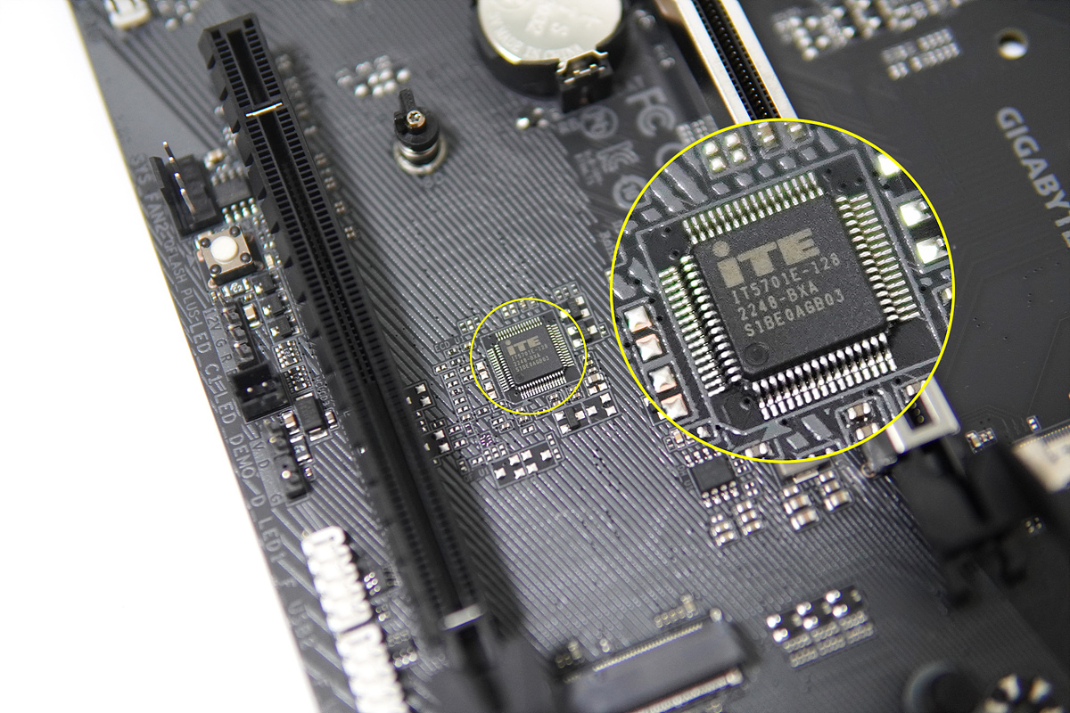 두 번째 M.2 슬롯 옆에는 RGB 컨트롤러인 IT5701E 칩셋이 있습니다.