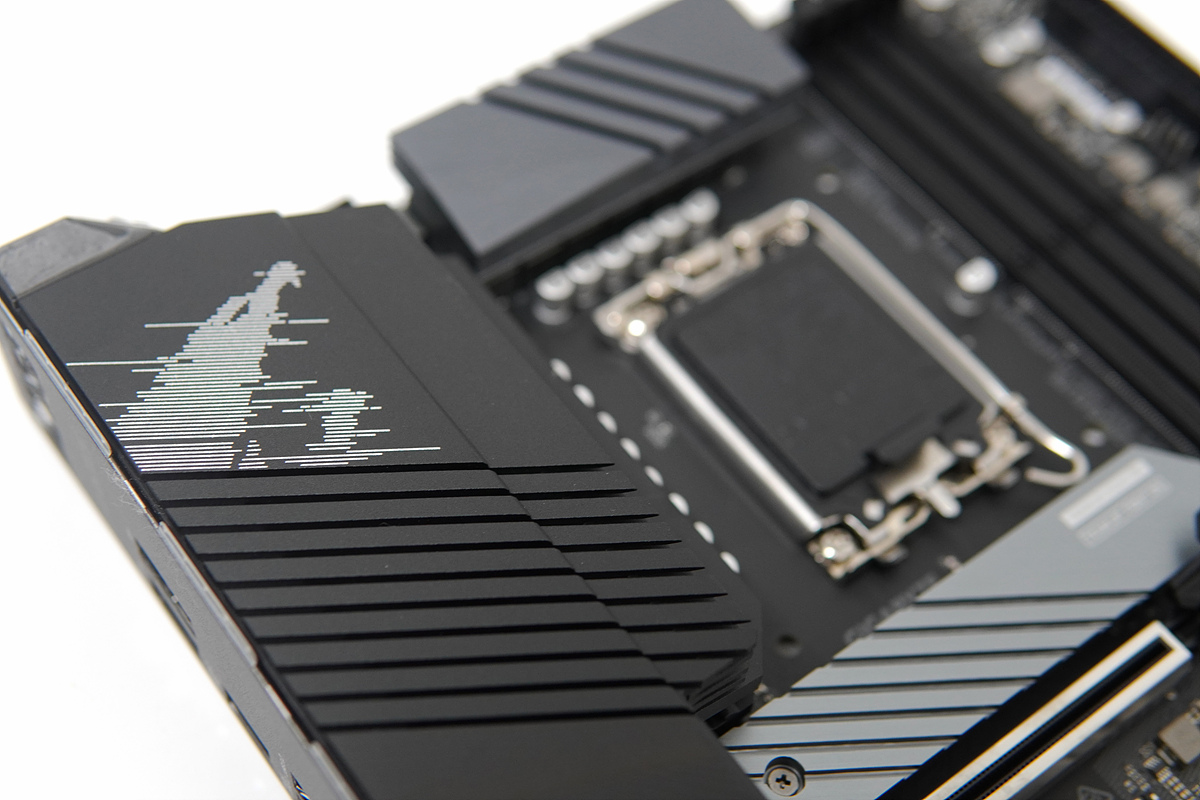 244mm x 244mm 작은 크기의 mATX라서 그런지 방열판 덕분에 다소 묵직한 느낌이 있으며 방열판의 색, 어로스 로고와 글자로 포인트를 주고 있습니다.