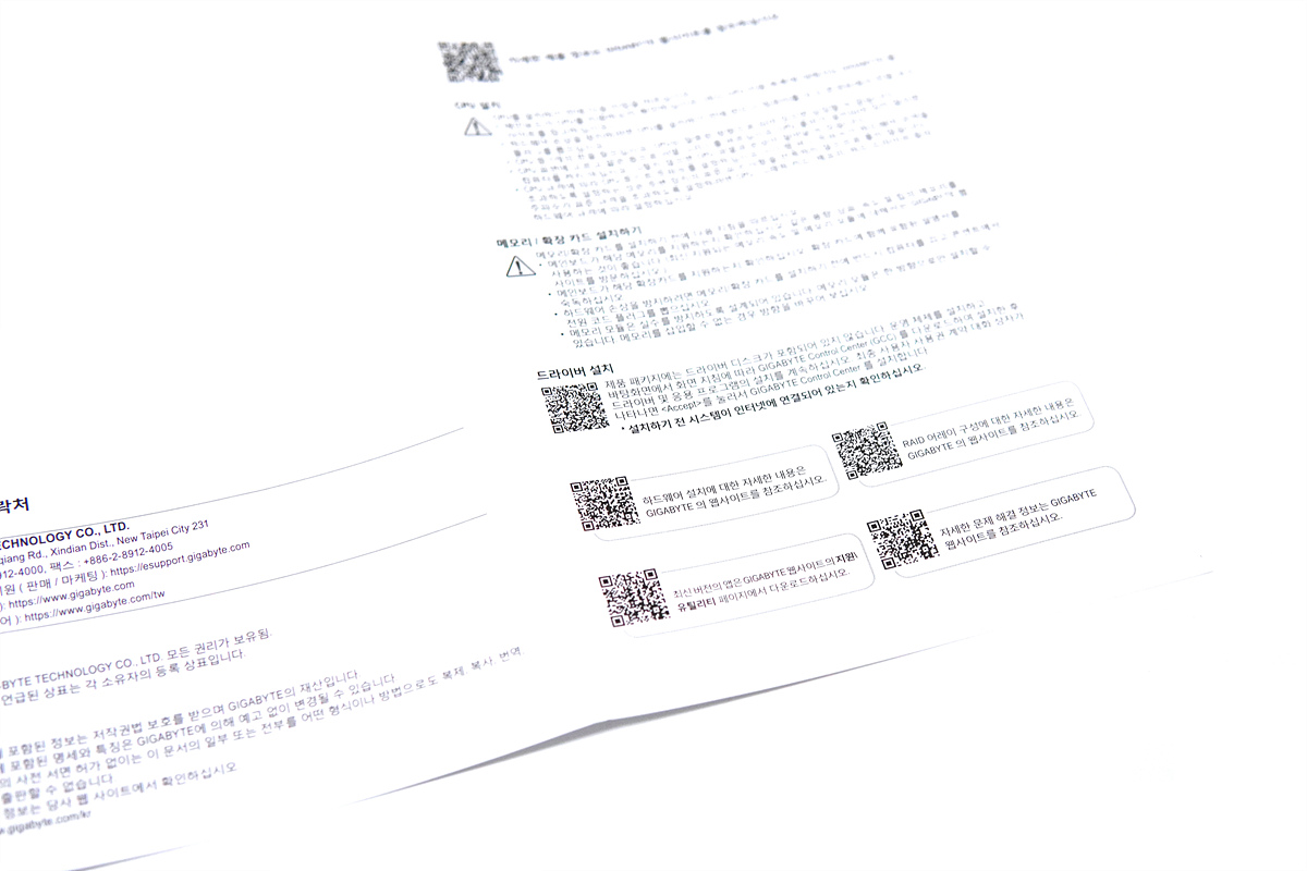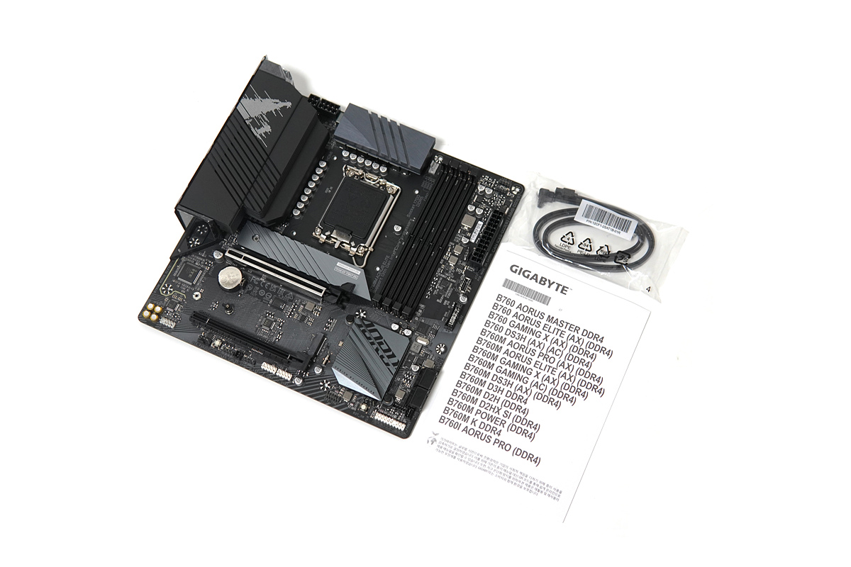 구성품은 메인보드, SATA 케이블, 설명서로 간단하게 이루어져 있습니다. AORUS 스티커나 액세서리 한 두 개 정도는 있었으면 하는 아쉬움이 남네요.