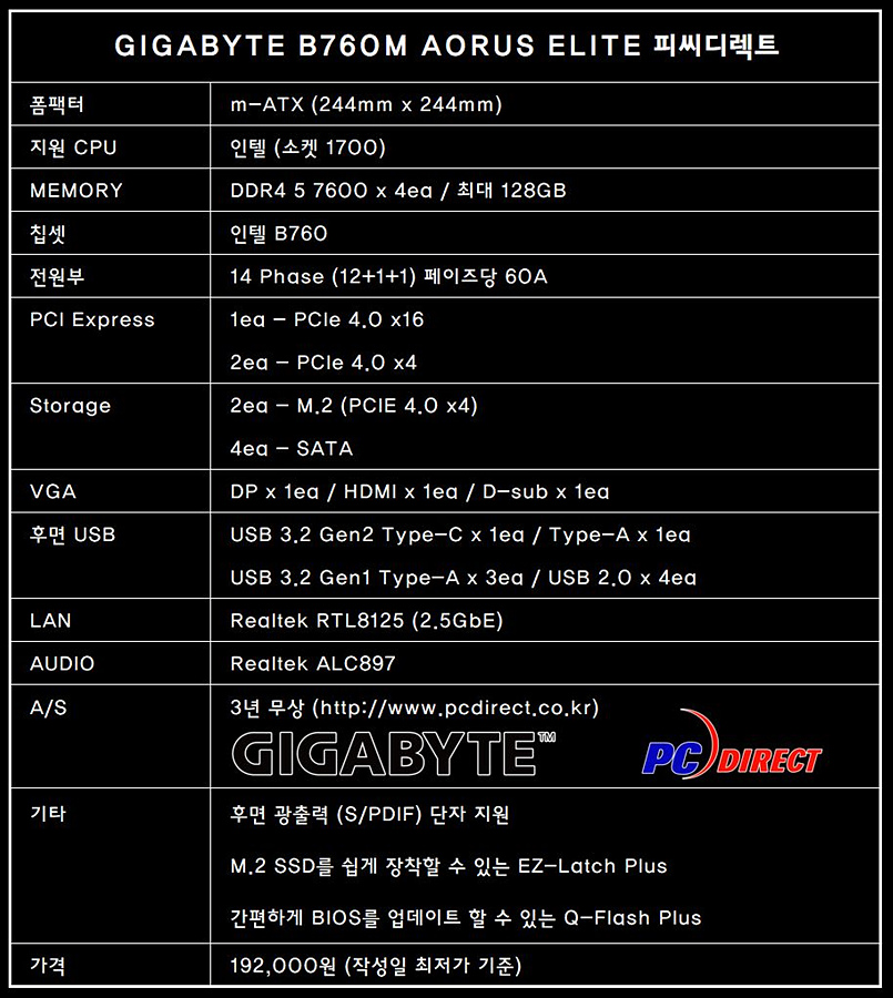 메인보드를 선택하는 기준은 사용자마다 다르지만 일반 사용자들은 아무래도 가격을 생각하지 않을 수 없죠. 성능 vs 가격 이 두 가지를 고민하다 보면 대부분의 사용자들은 Z가 아닌 B 라인의 보드를 선택하게 되고 현재는 B760이 가장 적당한 위치의 제품입니다. 기가바이트 B760M AORUS ELITE 피씨디렉트 메인보드는 이런 가성비와 함께 어로스(AORUS) 감성까지 챙길 수 있고 빵빵한 전원부와 방열판이 큰 장점으로 두 번째 M.2 슬롯에 장착된 EZ Latch Plus 기능은 상당히 인상적이었습니다. PC 부품의 가격이 전반적으로 높아진 지금의 시장에서는 19만 원대의 어로스라면 충분히 경쟁력을 가지고 있다고 생각합니다.